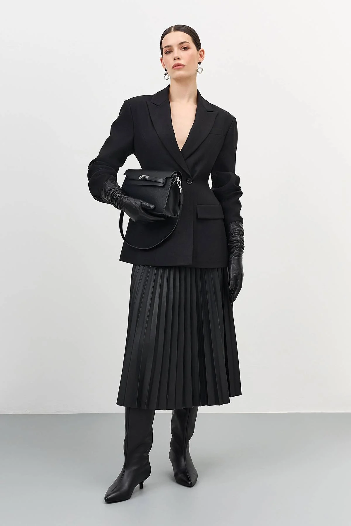 Юбка-плиссе из мягкой экокожи. Длина миди. А-силуэт. Застежка на молнию.
