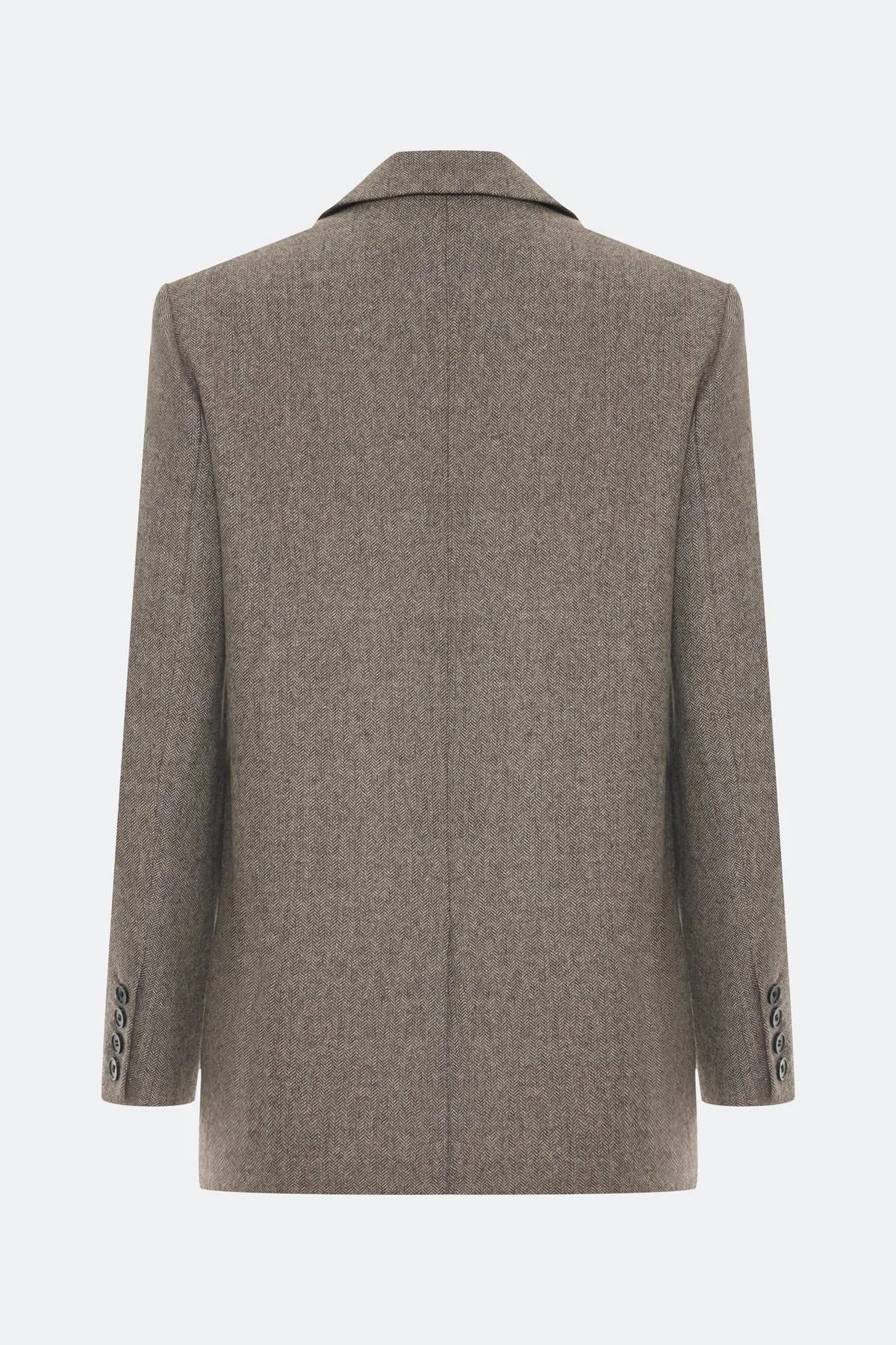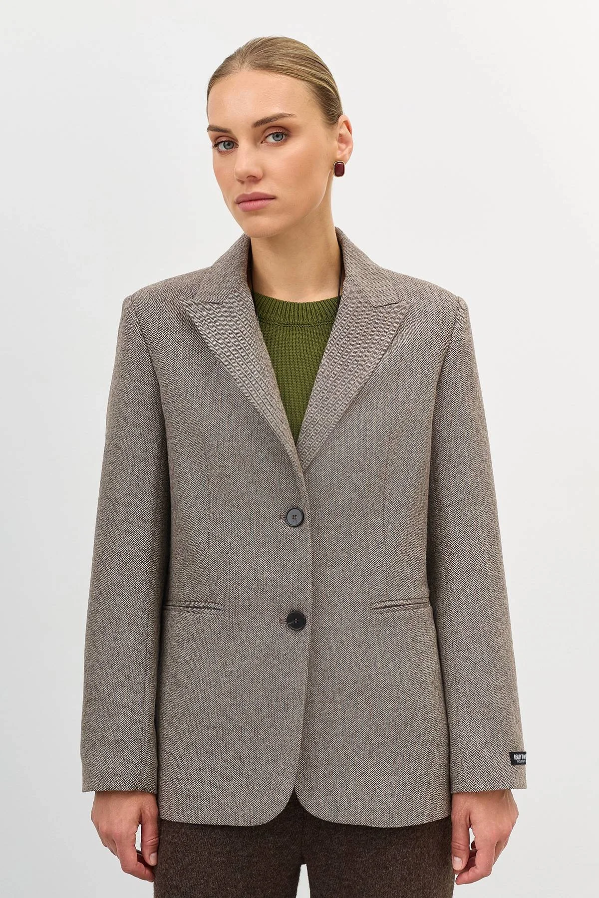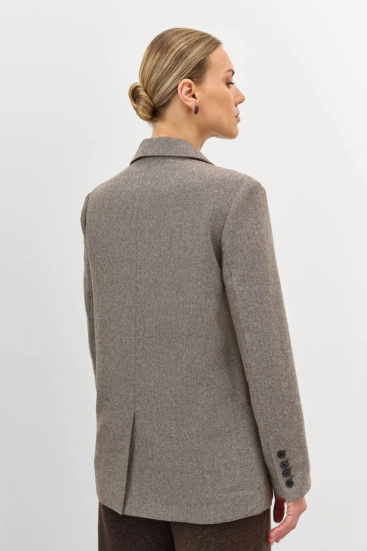 Однобортный жакет из смесовой шерсти с узором "ёлочка''. Прямой классический силуэт. Классический английский воротник с лацканами. Застежка на две пуговицы. Боковые прорезные карманы. Шлицы с пуговицами по низу рукавов. В комплекте с ремнем SVG202504.