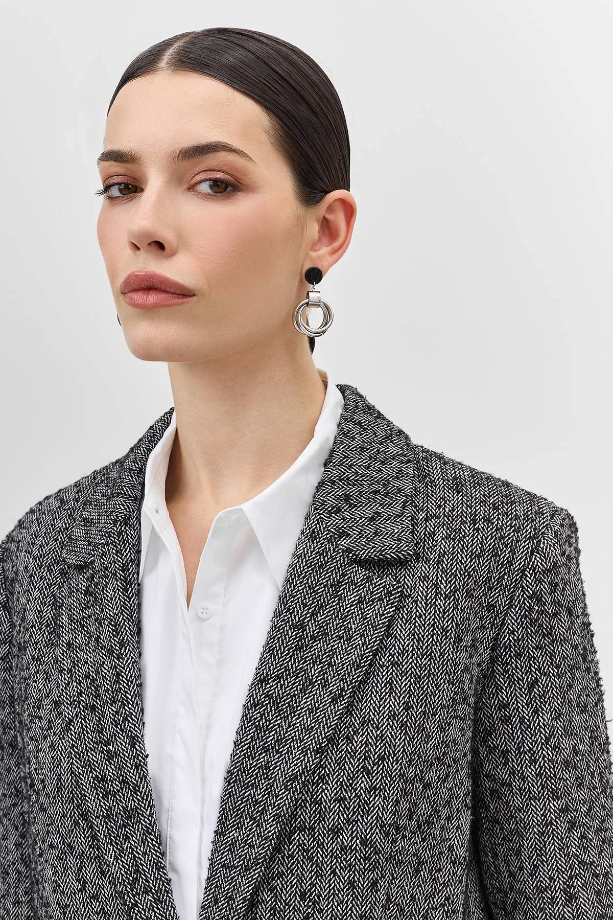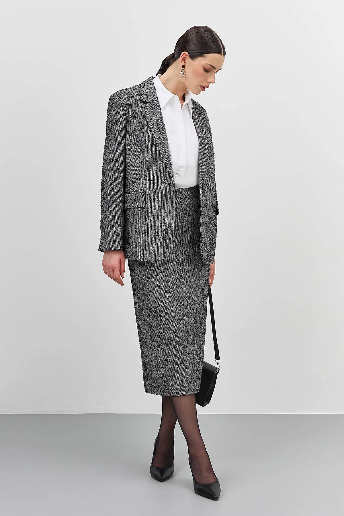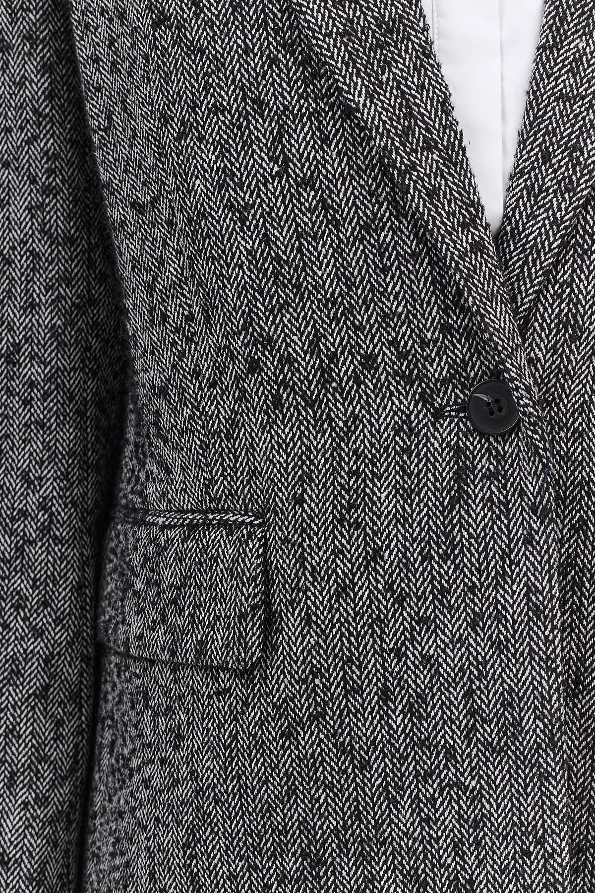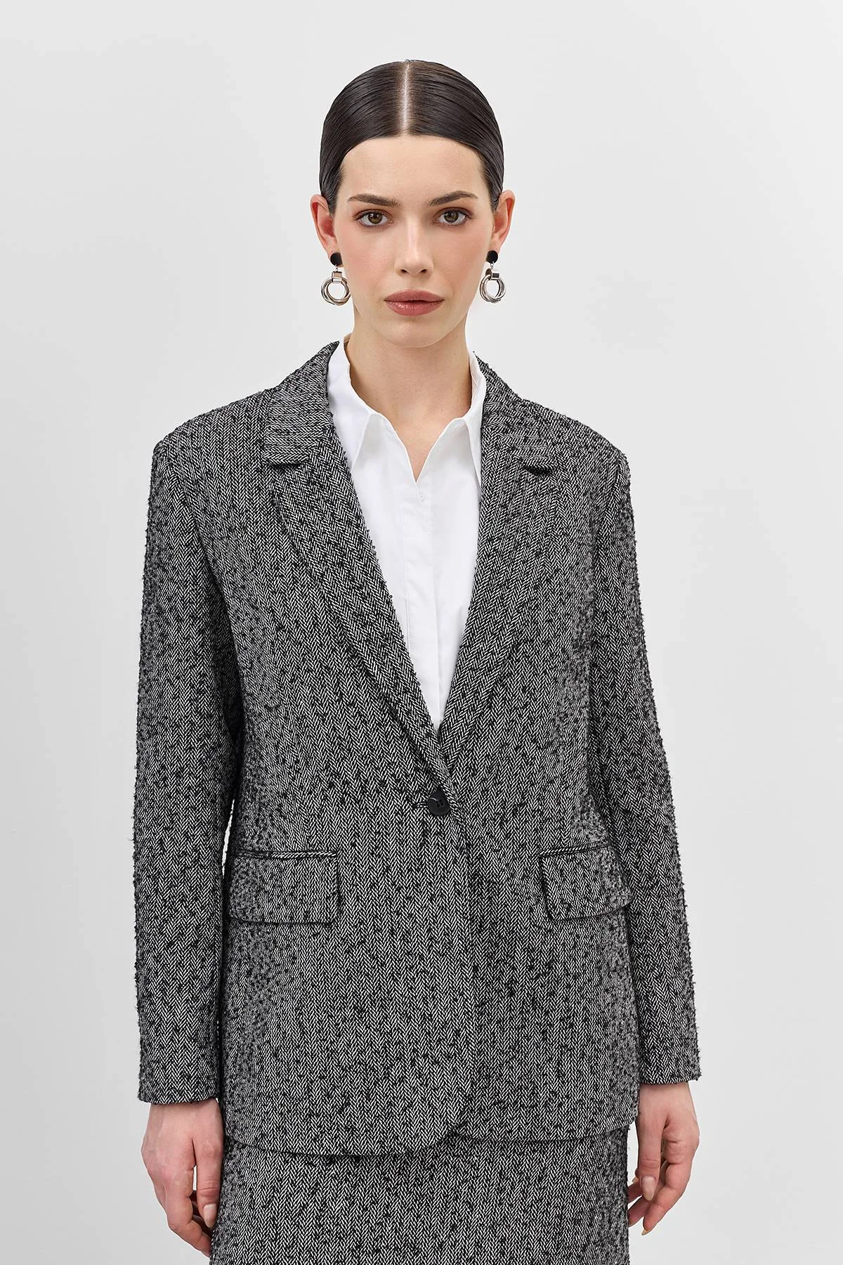 Однобортный жакет из твида с эффектом "букле". Прямой силуэт. Классический английский воротник с лацканами. Застежка на пуговицу. Боковые карманы с клапанами. Комплект с арт. 60508.
