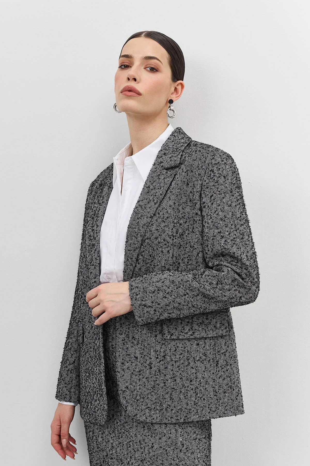 Однобортный жакет из твида с эффектом "букле". Прямой силуэт. Классический английский воротник с лацканами. Застежка на пуговицу. Боковые карманы с клапанами. Комплект с арт. 60508.