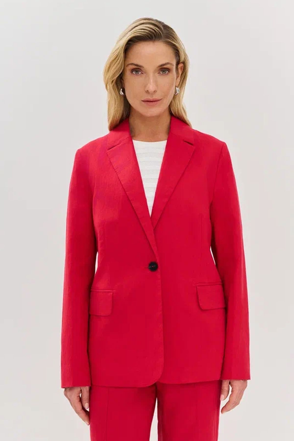 Однобортный жакет красного цвета с контрастной пуговицей, 52р