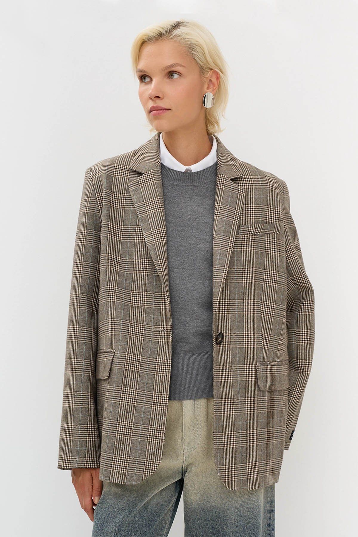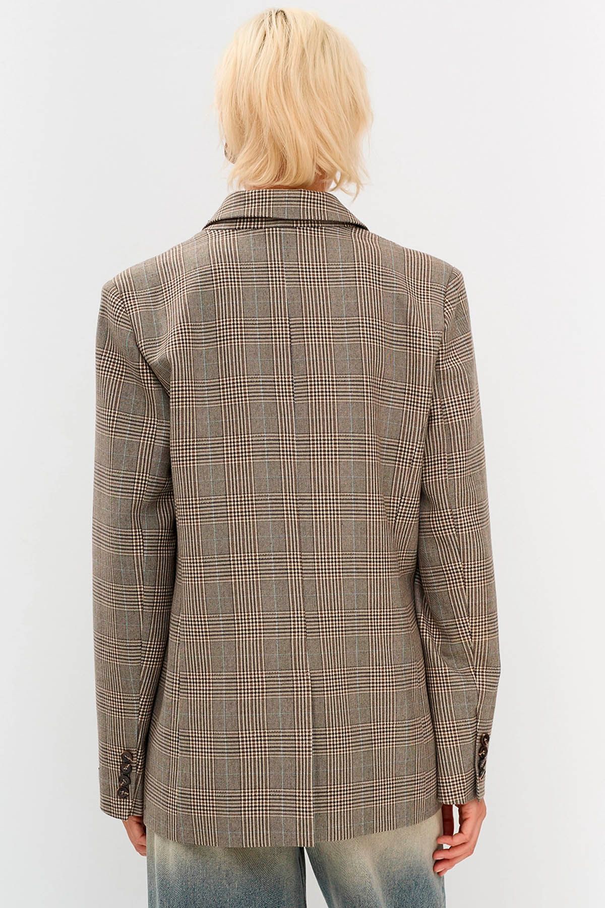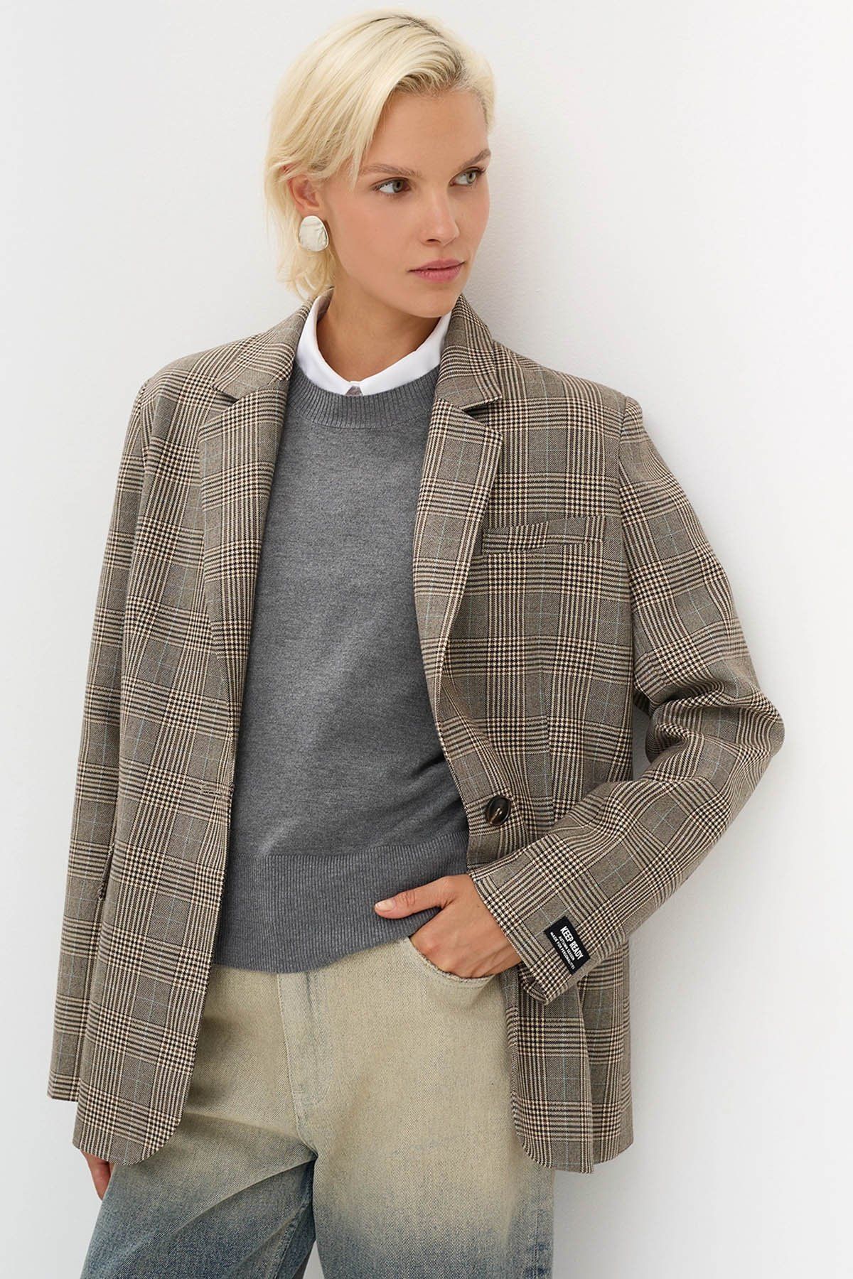 Однобортный жакет в клетку отлично подойдет как для не строгого офисного дресс-кода, так и для повседневных образов. Жакет застёгивается на пуговицу. Английский воротник создаёт V-образный вырез горловины. Манжеты декорированы пуговицами, аналогичными на полочке жакета. Дополнительный стильный акцент обеспечивается за счет карманов с клапанами. Имеется однотонная подкладка бежевого цвета, за счёт которой жакет подойдет для ношения в прохладную погоду. Жакет отлично сочетается в комплекте с брюками арт. 50410/75.