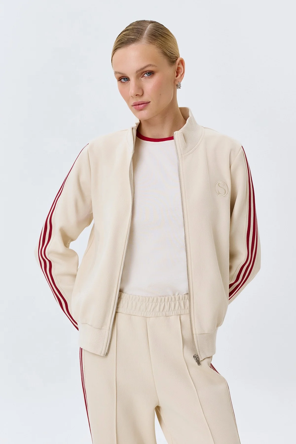 Трикотажный бомбер с контрастными лампасами, 48