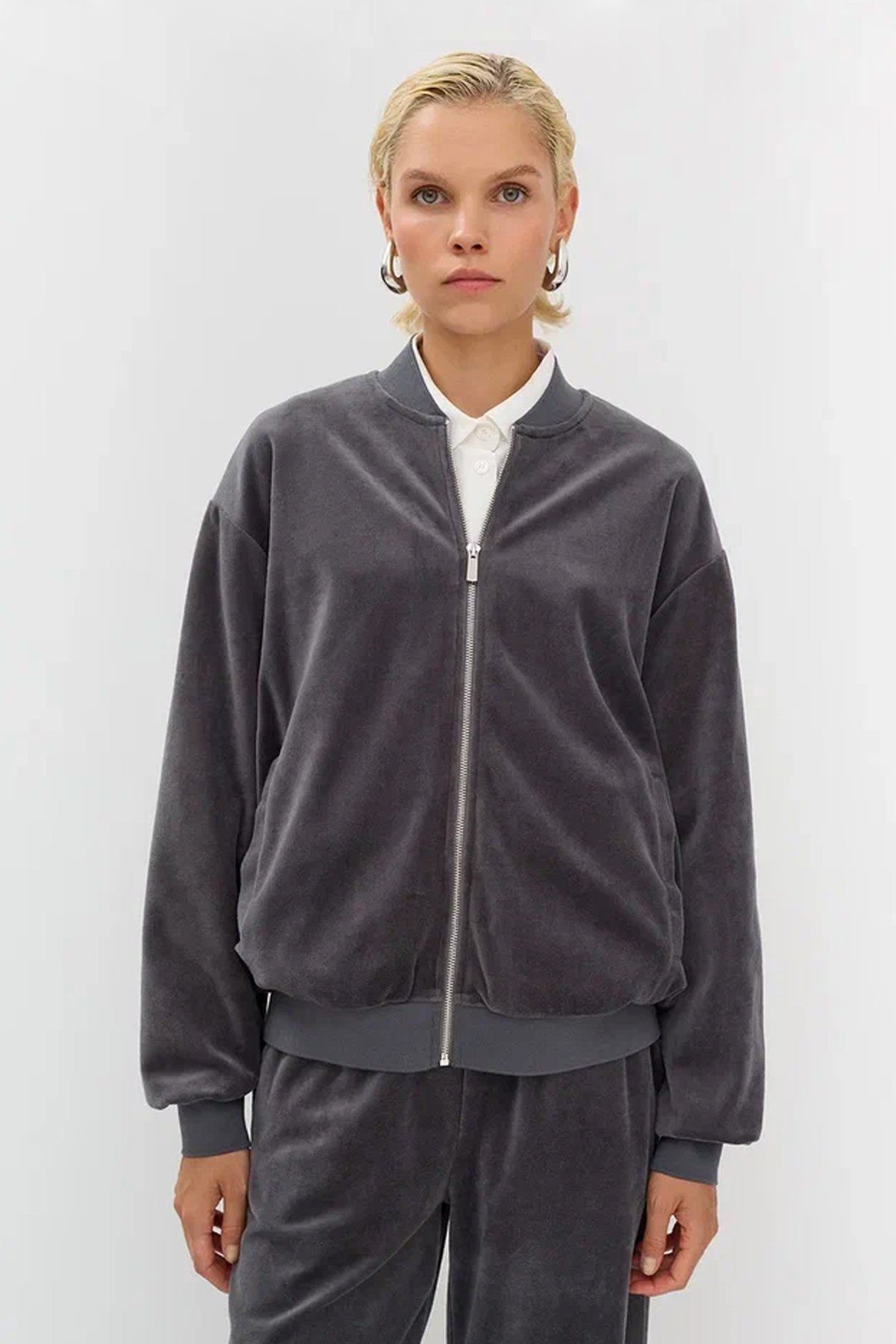 Велюровый жакет-бомбер с аппликацией из серебристых страз в сером цвете, 50р