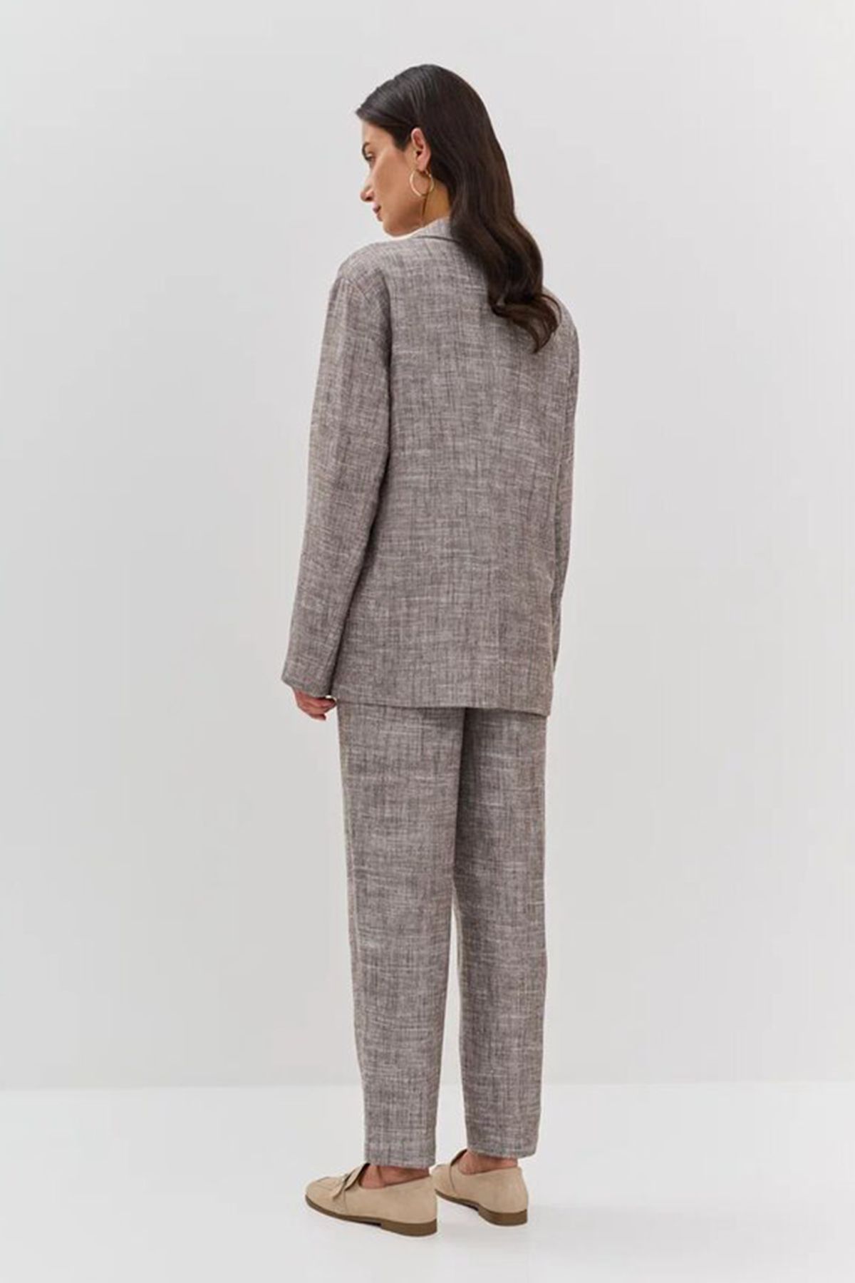 Однобортный жакет с акцентными пуговицами. В состав ткани входит вискоза, которая обеспечивает приятные тактильные ощущения. Элегантный английский воротник создаёт V-образный вырез, а приталенный силуэт подчеркивает фигуру и придает образу строгости и женственности. Застежка на пуговицы обеспечивает практичность, а боковые карманы с клапанами добавляют функциональность и акцентируют внимание на дизайне. Данный жакет - идеальный выбор как для офисного наряда, так и для вечернего выхода.
