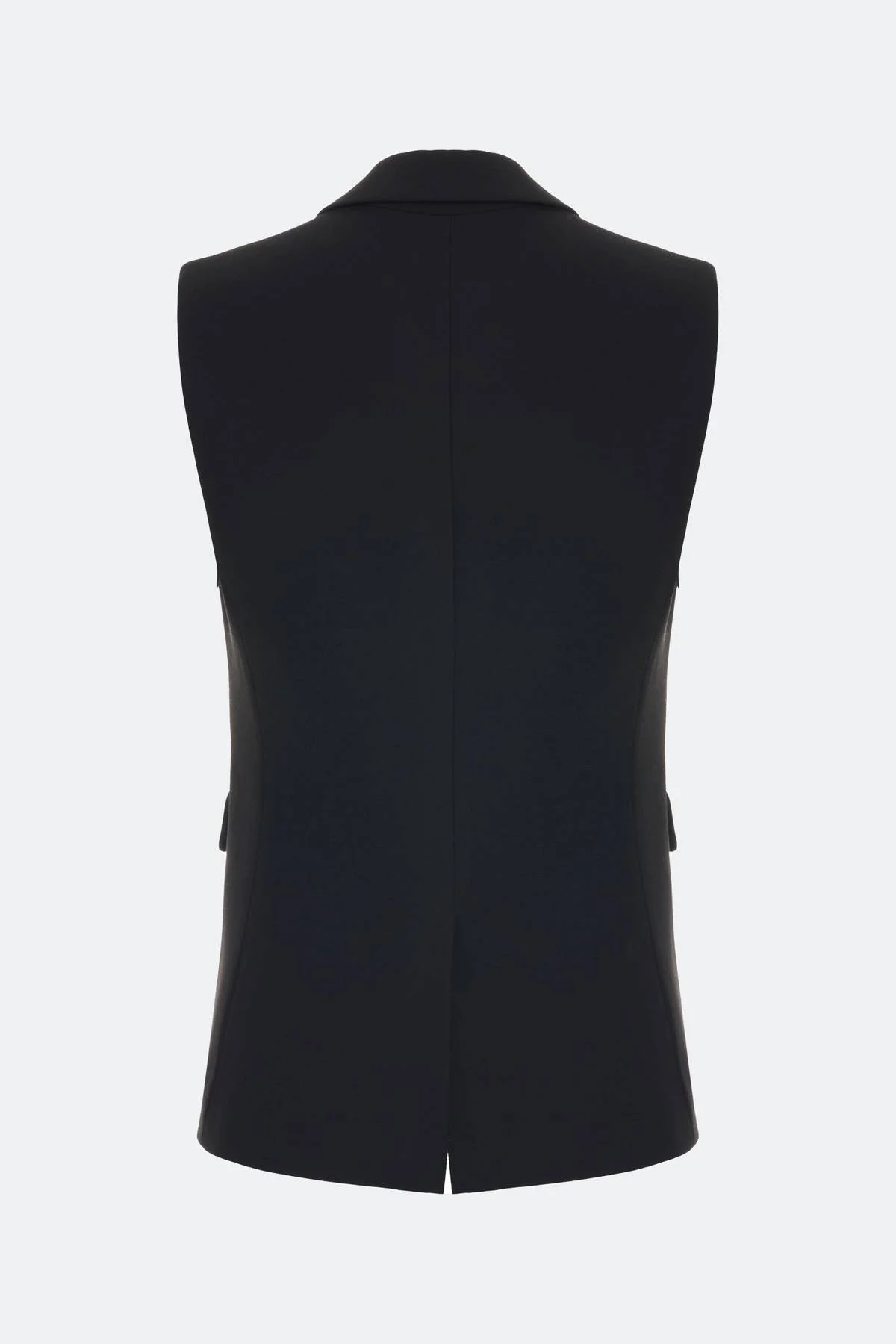 Классичекий удлиненный жилет приталенного силуэта. Английский воротник с лацканами. Застежка на пуговицы. Нагрудный карман с листочкой. Боковые карманы с клапанами. В составе район и спандекс.