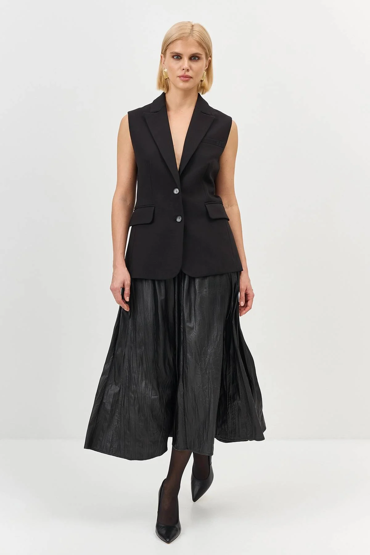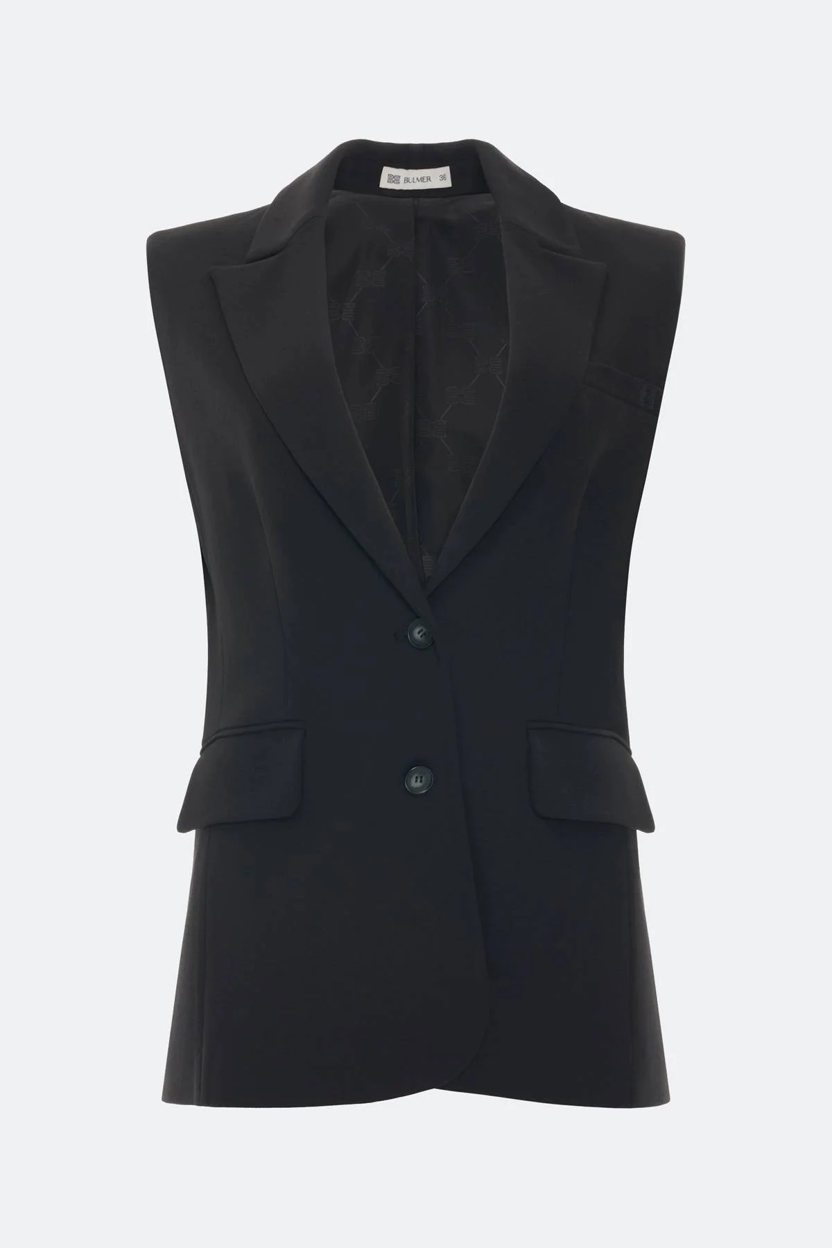 Классичекий удлиненный жилет приталенного силуэта. Английский воротник с лацканами. Застежка на пуговицы. Нагрудный карман с листочкой. Боковые карманы с клапанами. В составе район и спандекс.