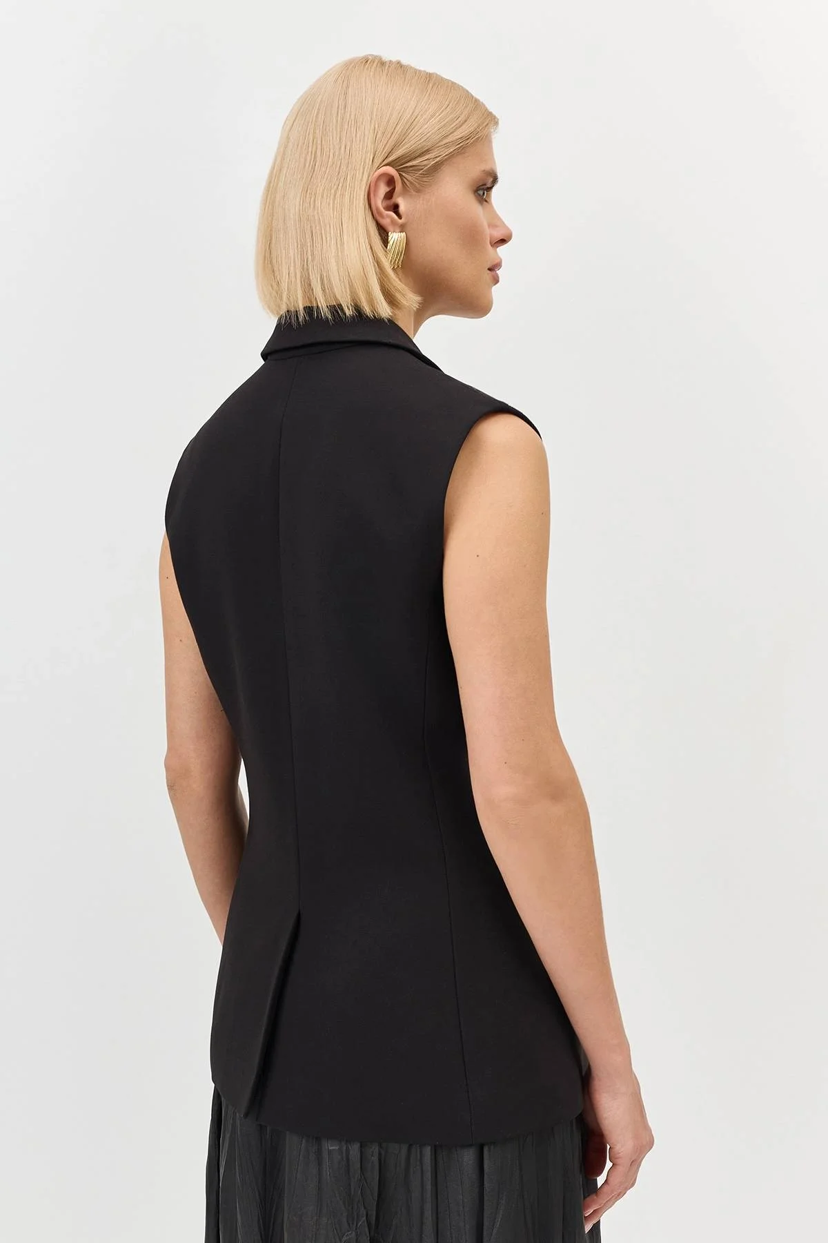 Классичекий удлиненный жилет приталенного силуэта. Английский воротник с лацканами. Застежка на пуговицы. Нагрудный карман с листочкой. Боковые карманы с клапанами. В составе район и спандекс.