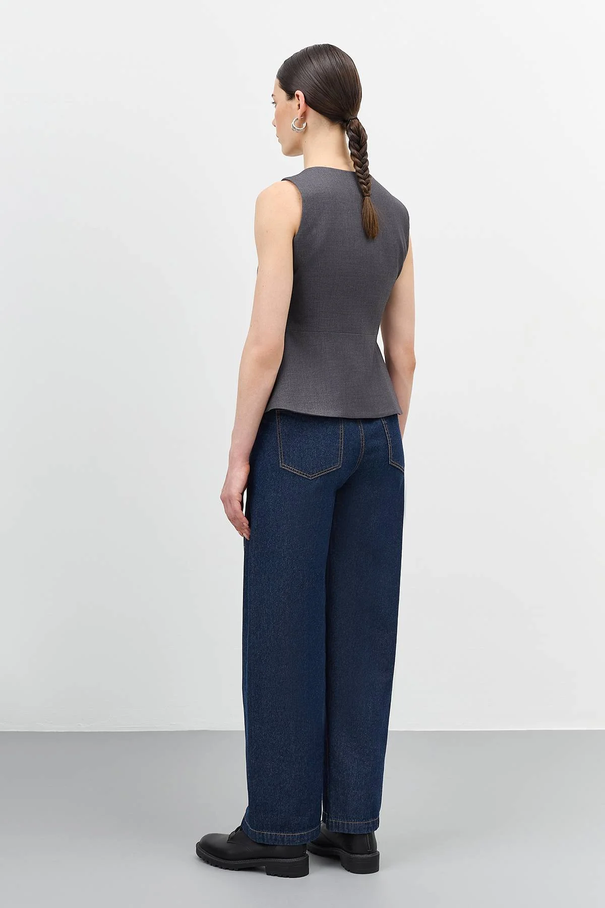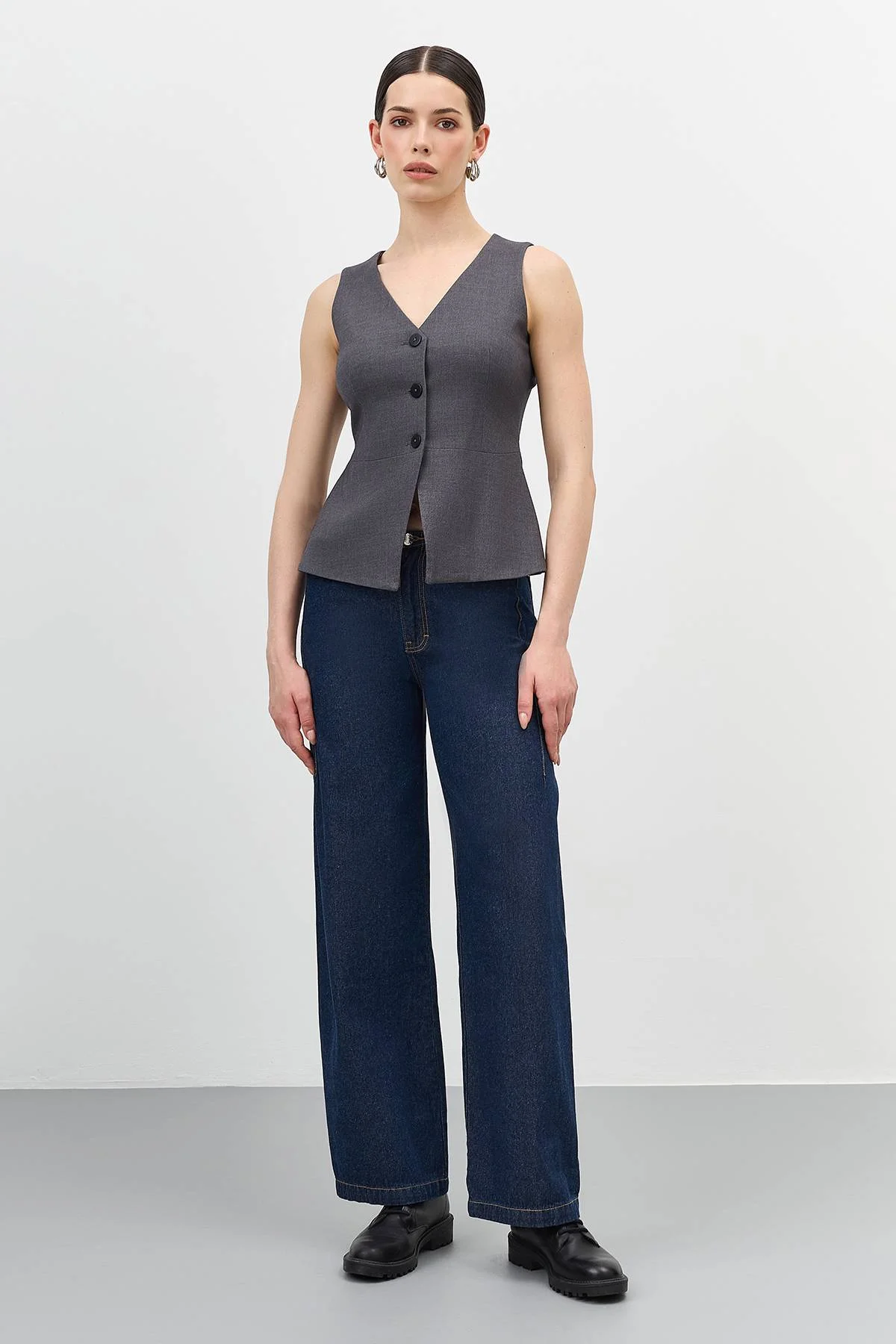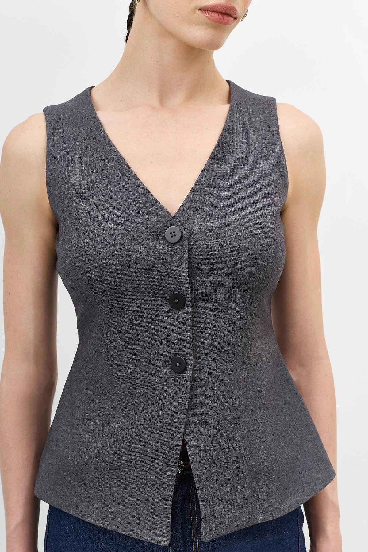 Удлиненный приталенный классический жилет. V-образный вырез. Застежка на пуговицы. В составе вискоза и шерсть. Подкладка из 100% вискозы