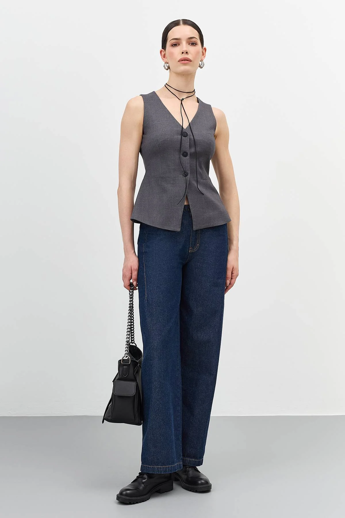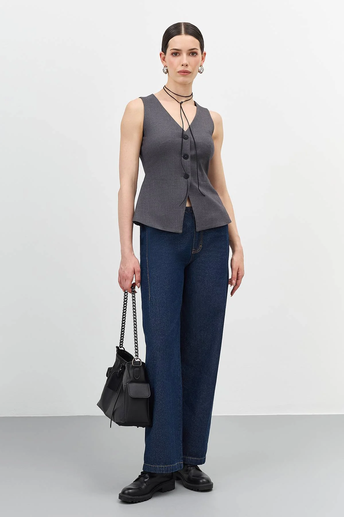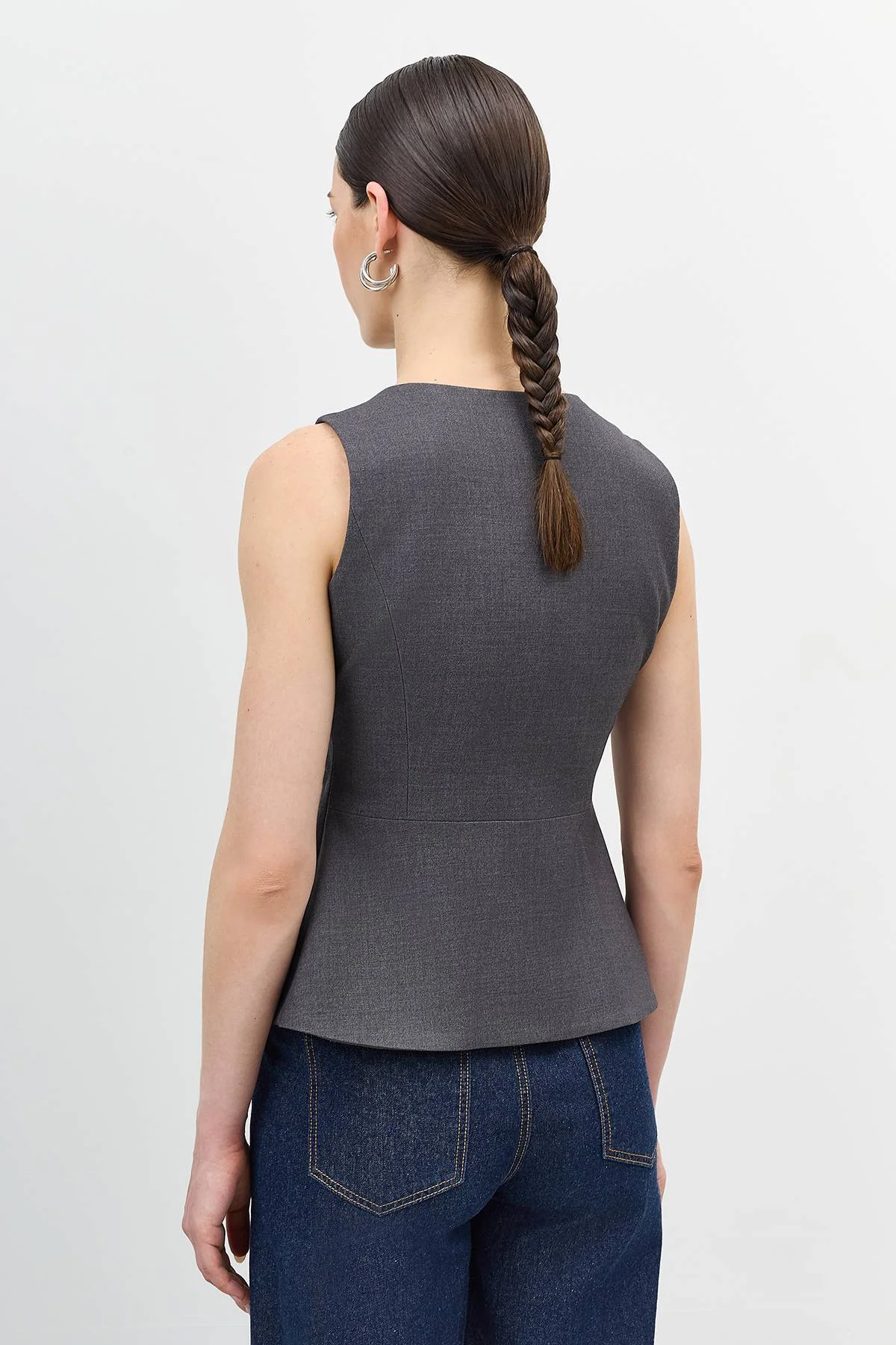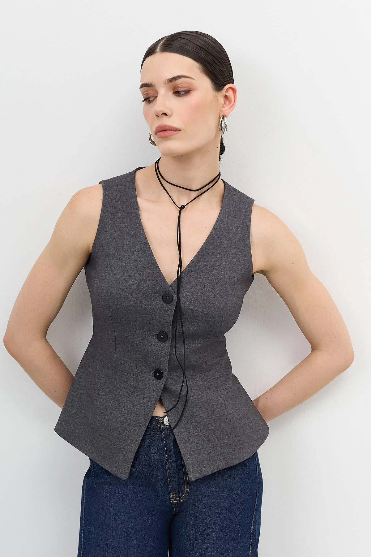 Удлиненный приталенный классический жилет. V-образный вырез. Застежка на пуговицы. В составе вискоза и шерсть. Подкладка из 100% вискозы