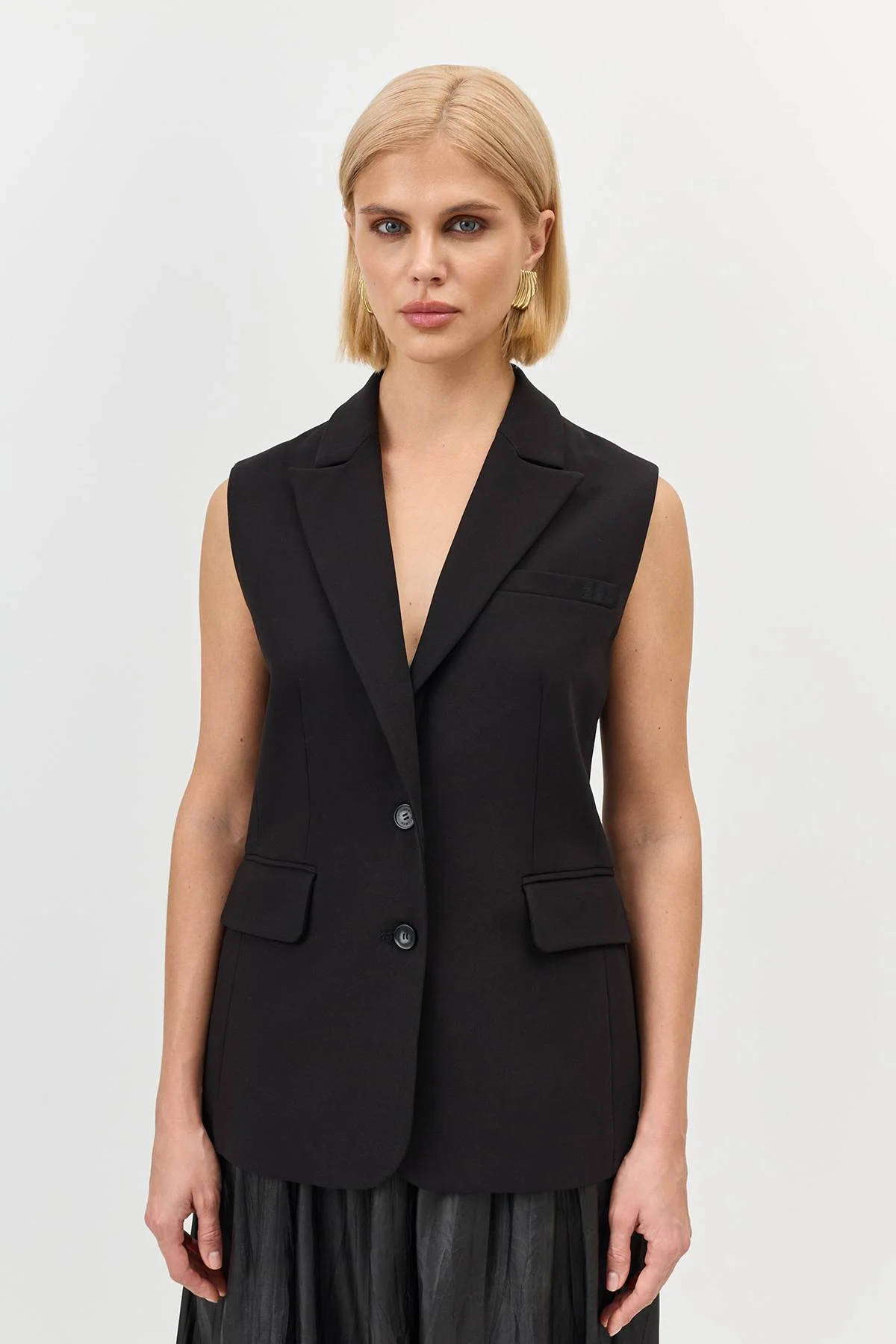 Классичекий удлиненный жилет приталенного силуэта. Английский воротник с лацканами. Застежка на пуговицы. Нагрудный карман с листочкой. Боковые карманы с клапанами. В составе район и спандекс. В комплекте с палантином LBL54-645-01.