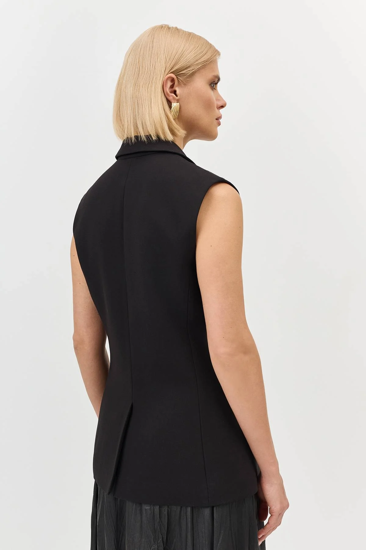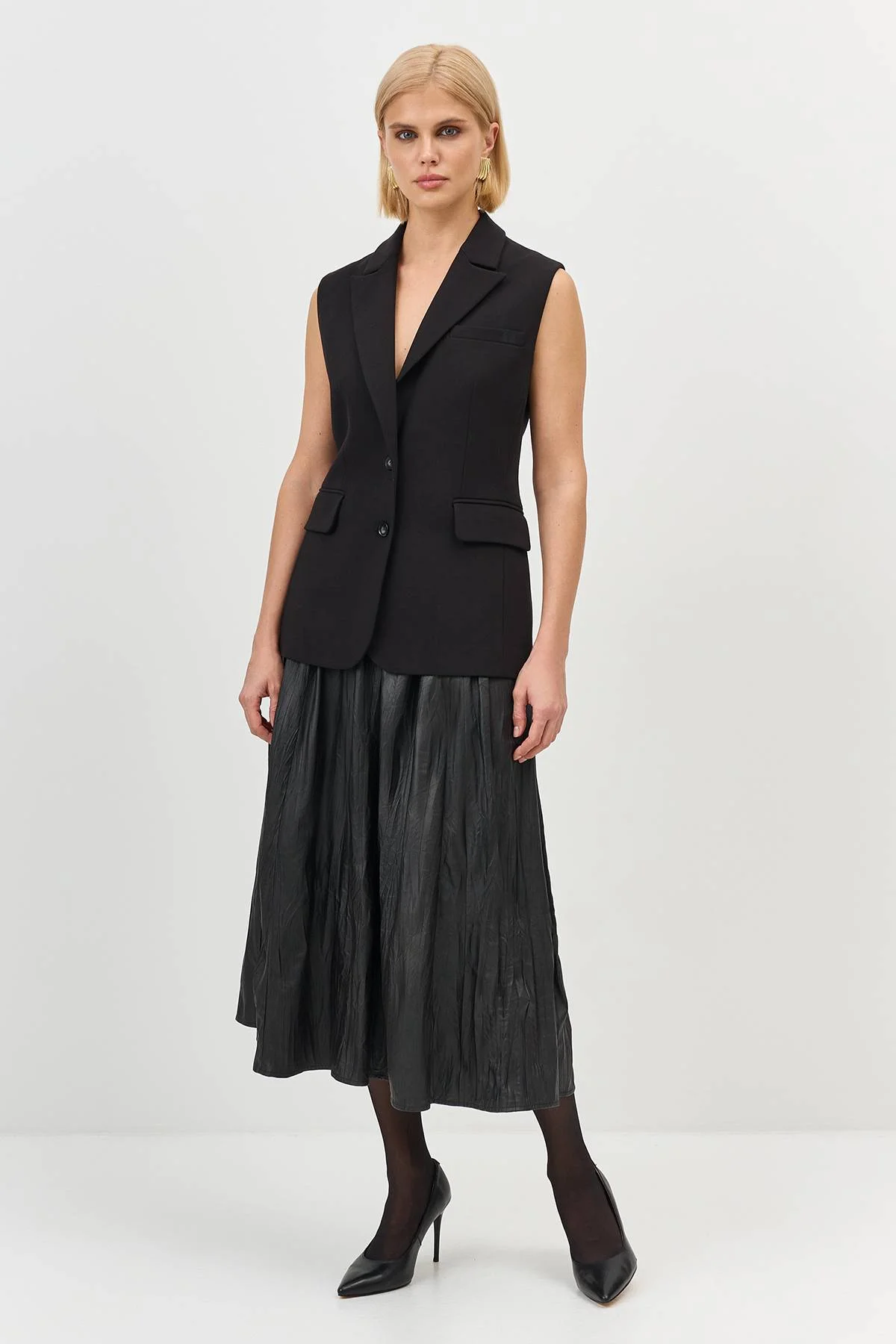 Классичекий удлиненный жилет приталенного силуэта. Английский воротник с лацканами. Застежка на пуговицы. Нагрудный карман с листочкой. Боковые карманы с клапанами. В составе район и спандекс. В комплекте с палантином LBL54-645-01.