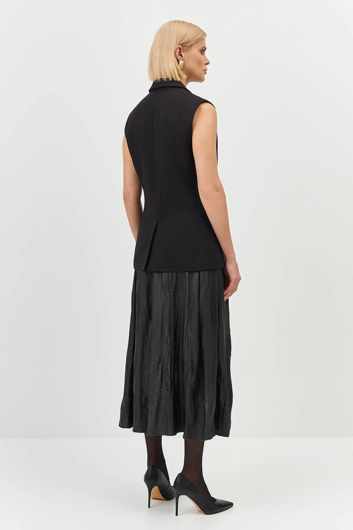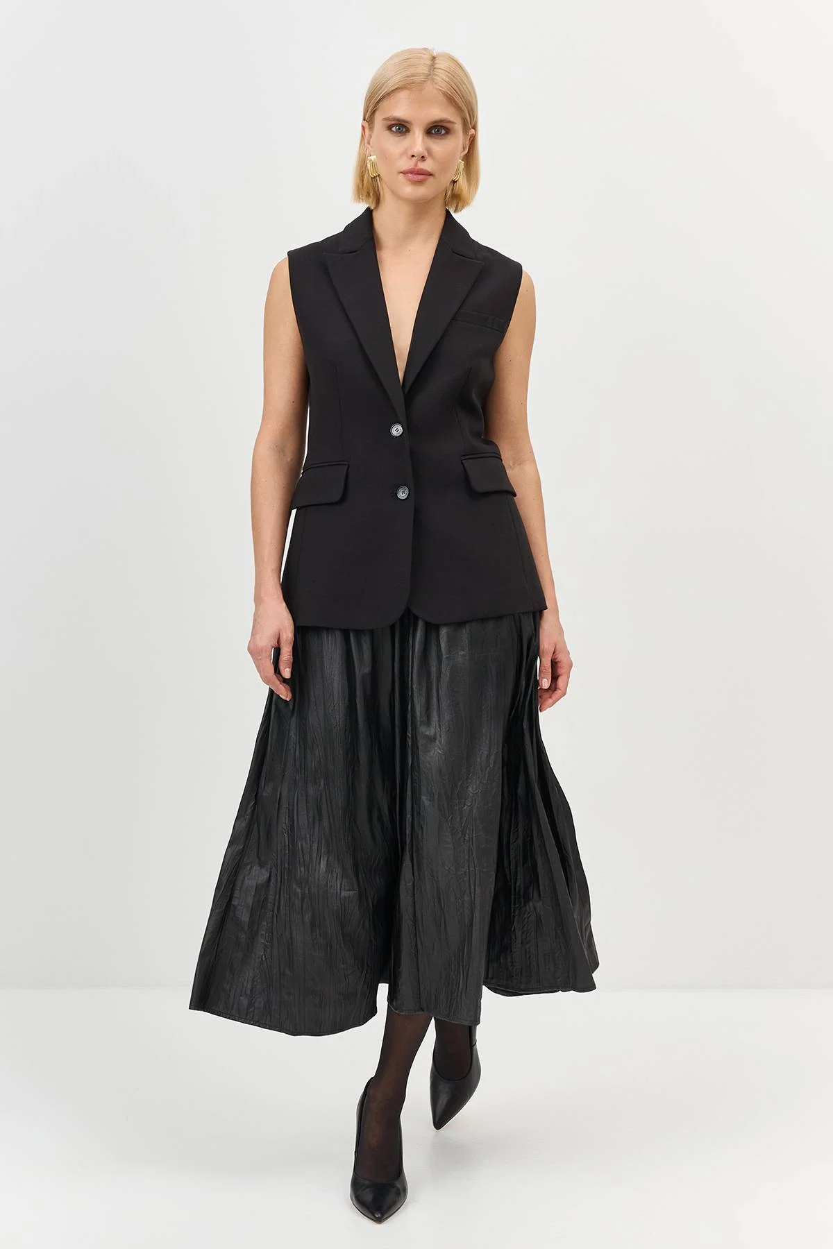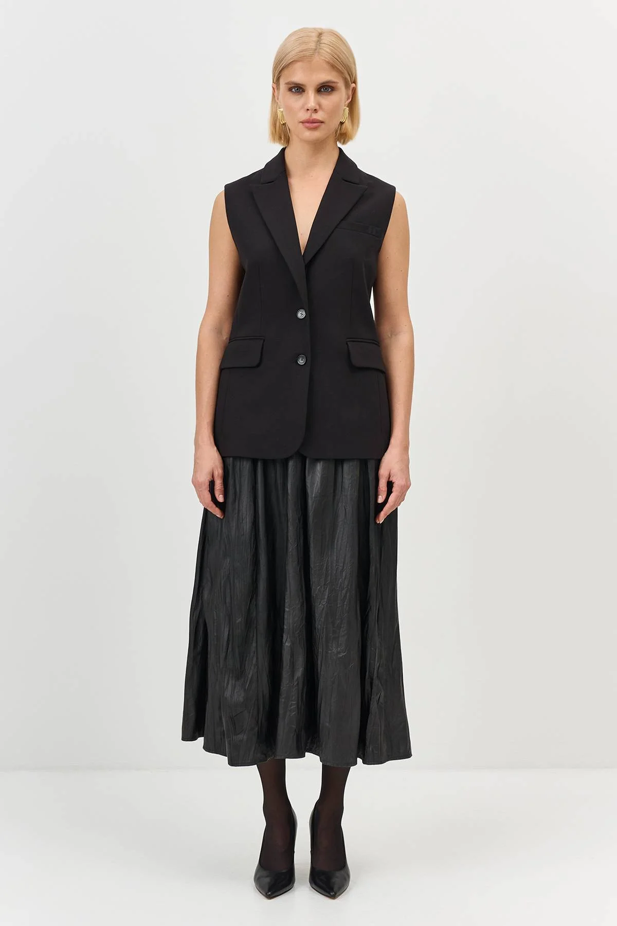 Классичекий удлиненный жилет приталенного силуэта. Английский воротник с лацканами. Застежка на пуговицы. Нагрудный карман с листочкой. Боковые карманы с клапанами. В составе район и спандекс. В комплекте с палантином LBL54-645-01.