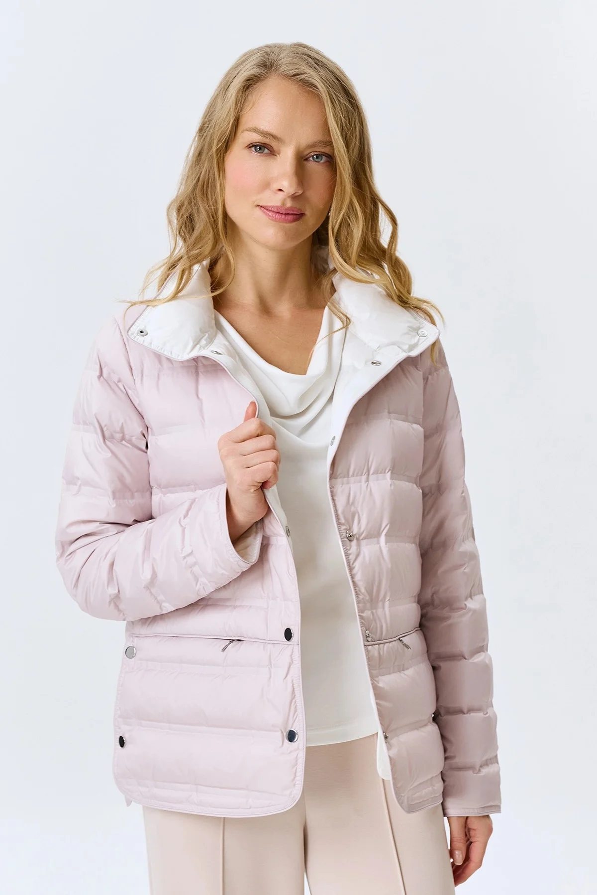 Легкая куртка с горизонтальной горячей стежкой. Прямой силуэт. Воротник стойка на кнопках. Застежка на металлические кнопки. Боковые карманы на молнии. Длинные втачные рукава. Дополнена контрастной подкладкой и акцентными разрезами на кнопках в боковых швах. В качестве утеплителя натуральный пух.