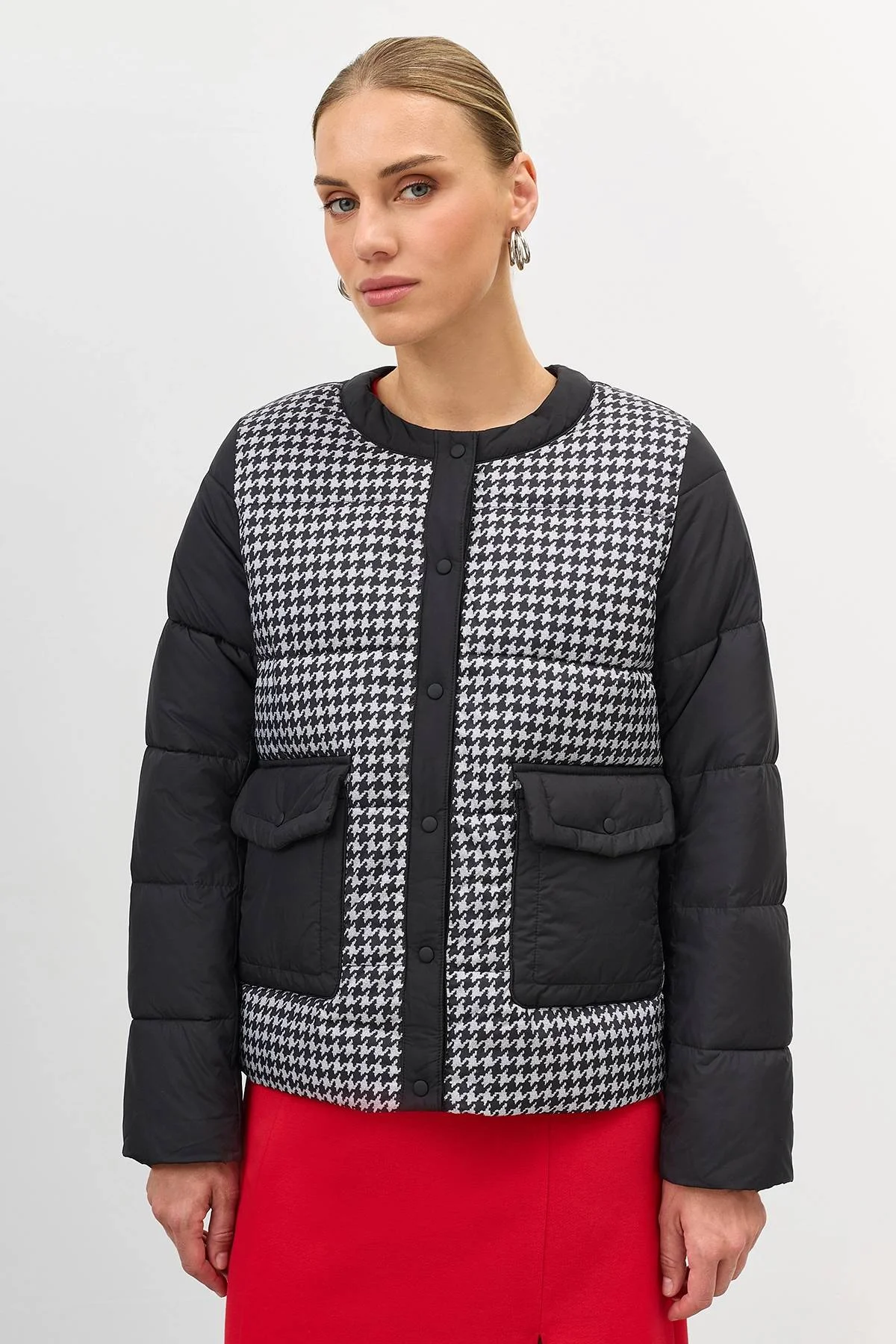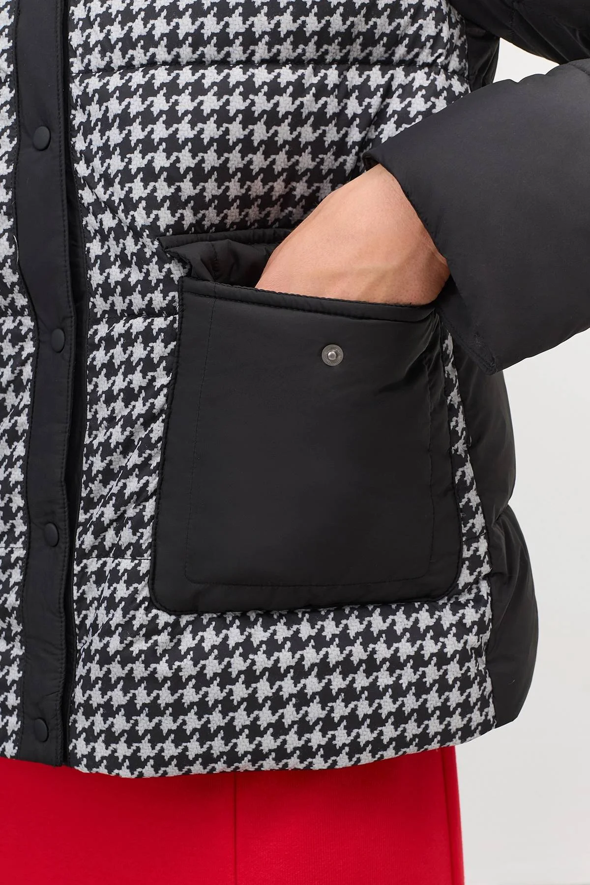 Куртка Savage 60103/9 - Укороченная модель с эффектным принтом «гусиная лапка» и контрастными деталями создает яркий городской образ. Практичные накладные карманы с клапанами и застежка на кнопки добавляют функциональности. Легкий утеплитель и гладкая ткань обеспечивают комфорт в демисезон. В комплекте с палантином LBL34-348-02
