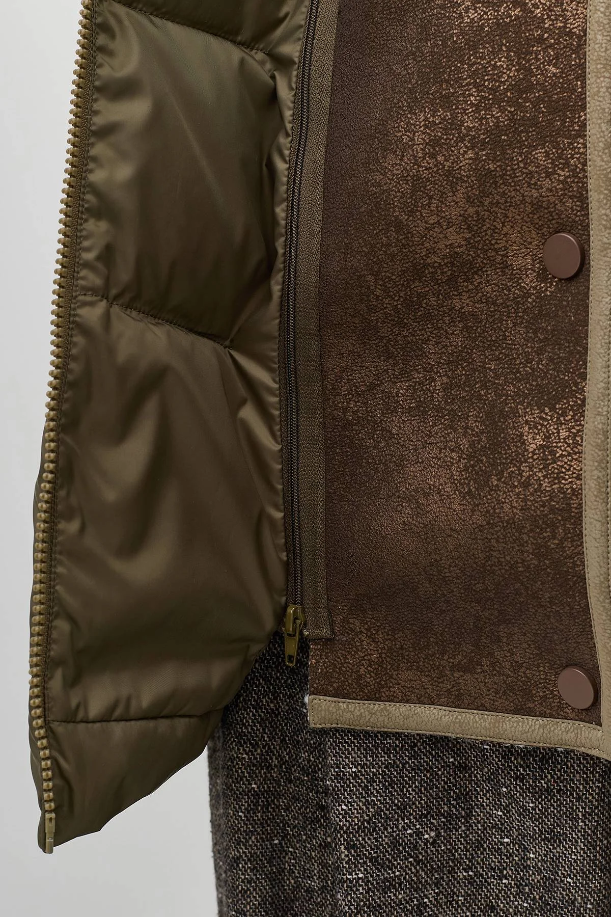 Удлиненная стеганная куртка. Свободный силуэт немного расширен к низу. Спущенная линия плеч. Боковые разрезы на потайных молниях. Застежка на молнию. Завышенные боковые карманы на молнии. Воротник стойка меняется на отложной воротник. Дополнена съемной манишкой из мягкой искуственной овчины на кнопках с капюшоном.