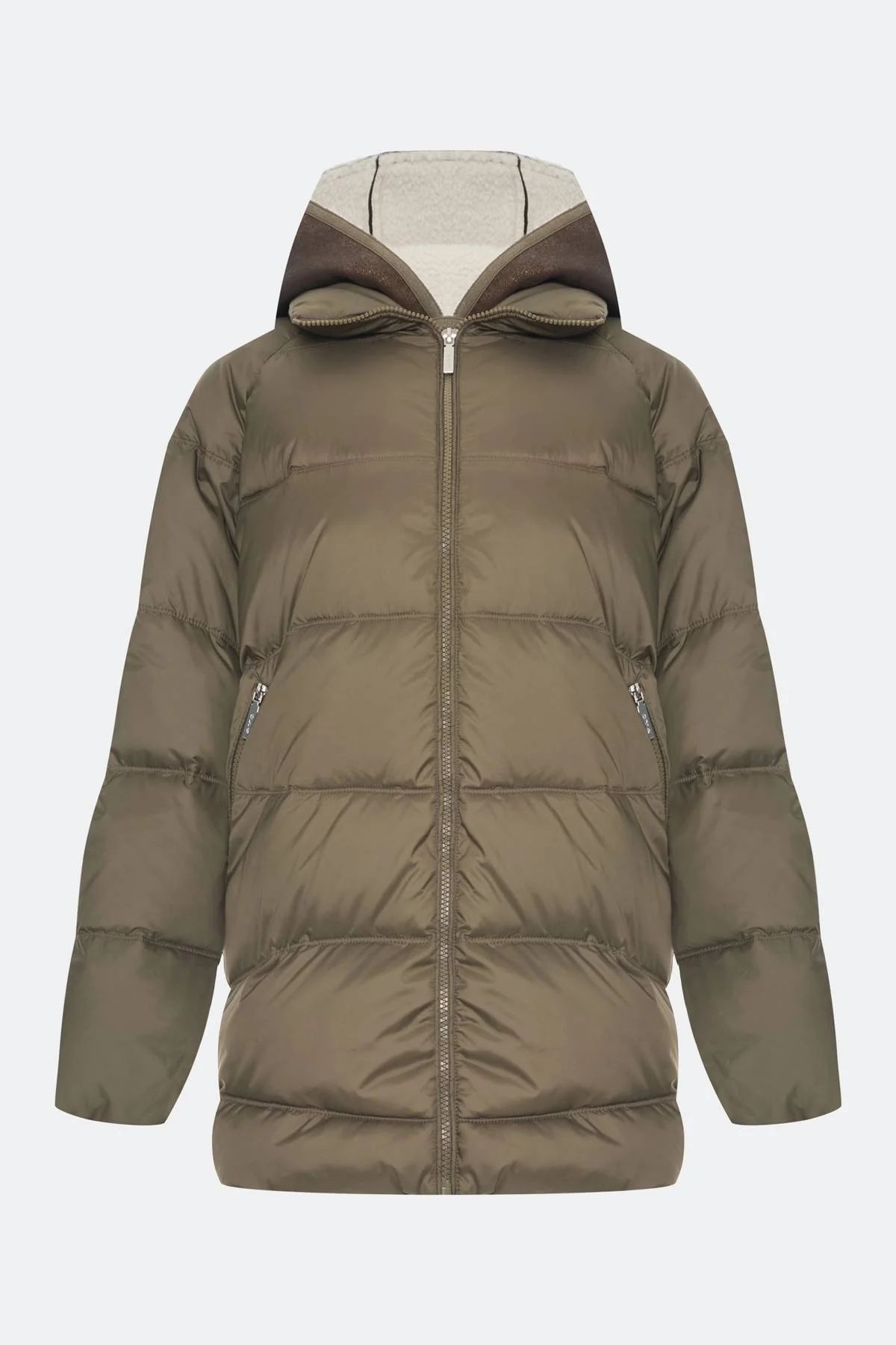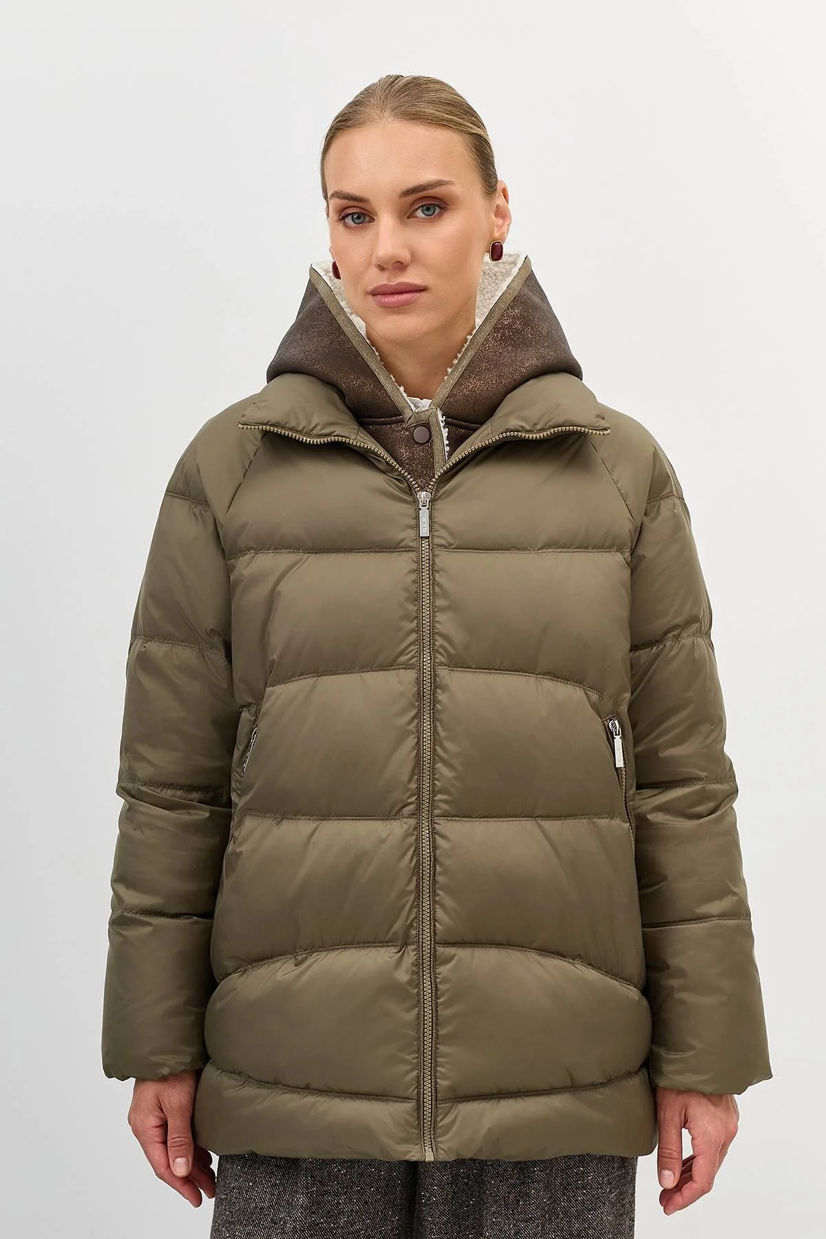 Удлиненная стеганная куртка. Свободный силуэт немного расширен к низу. Спущенная линия плеч. Боковые разрезы на потайных молниях. Застежка на молнию. Завышенные боковые карманы на молнии. Воротник стойка меняется на отложной воротник. Дополнена съемной манишкой из мягкой искуственной овчины на кнопках с капюшоном.