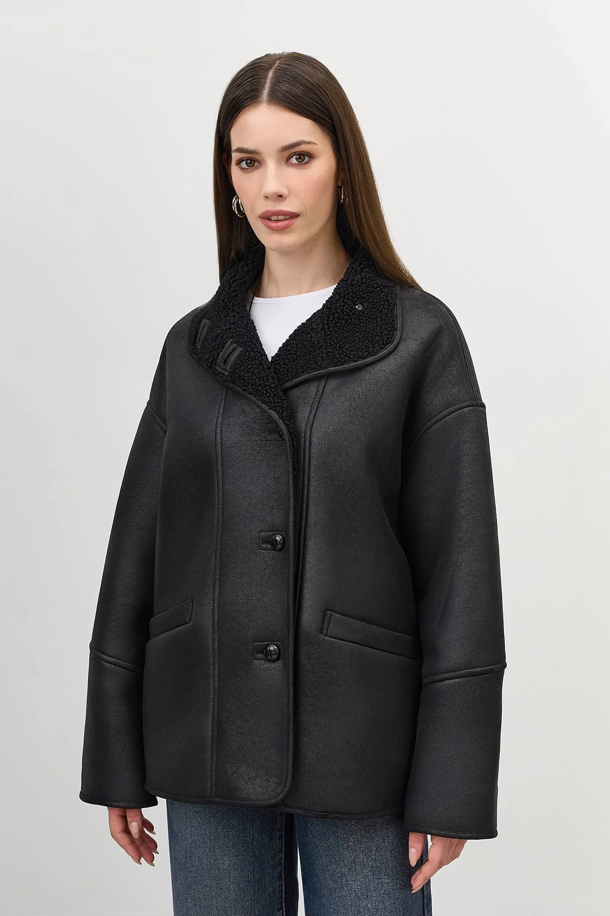 Свободная дубленка из искусственной овчины. Силуэт Oversize. Спущенная линия плеч. Боковые карманы с листочками. Отложной воротник меняется на воротник стойку. Застежка на акцентные пуговицы в цвет. Закругленная линия низа. Рукава с отворотами по низу.