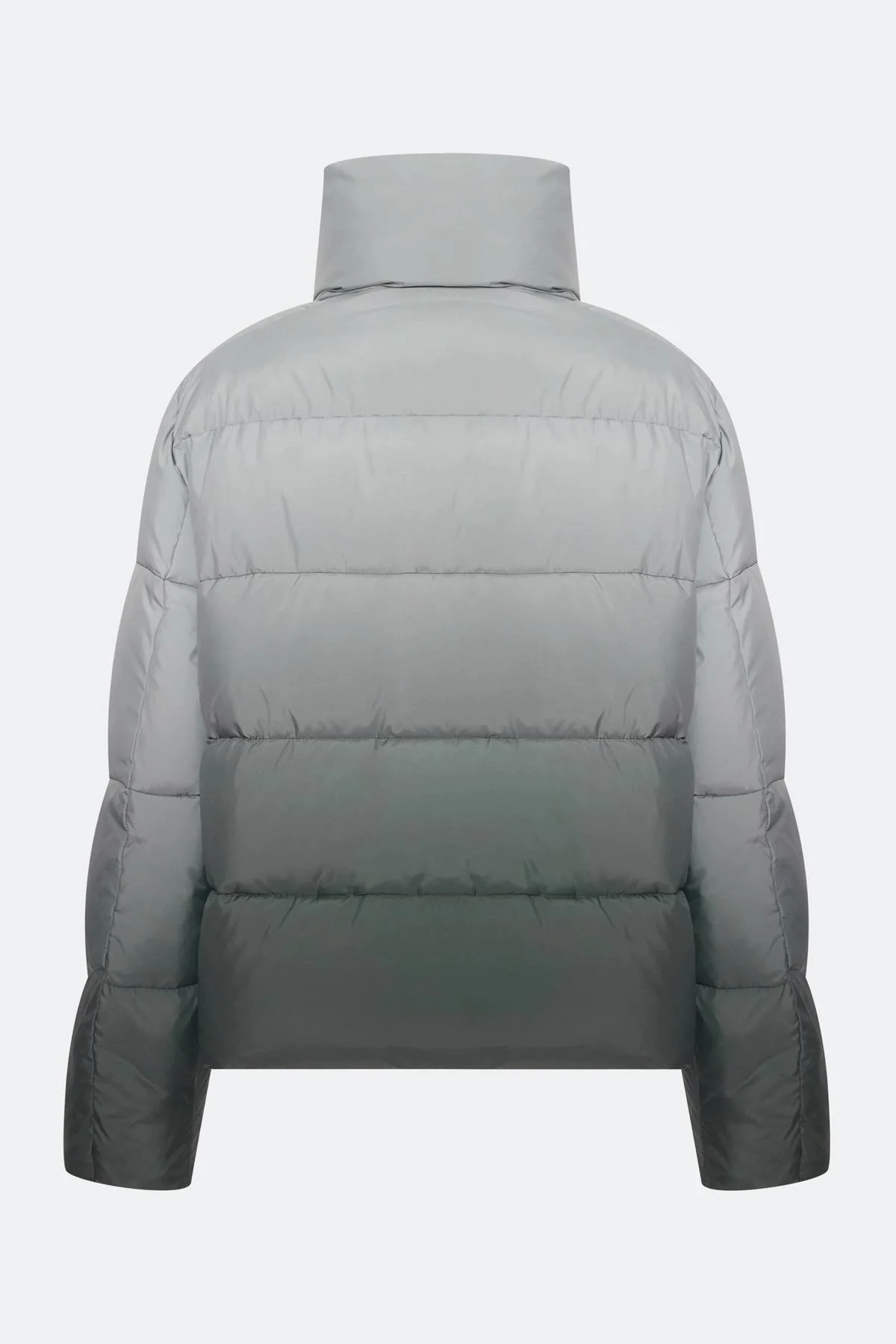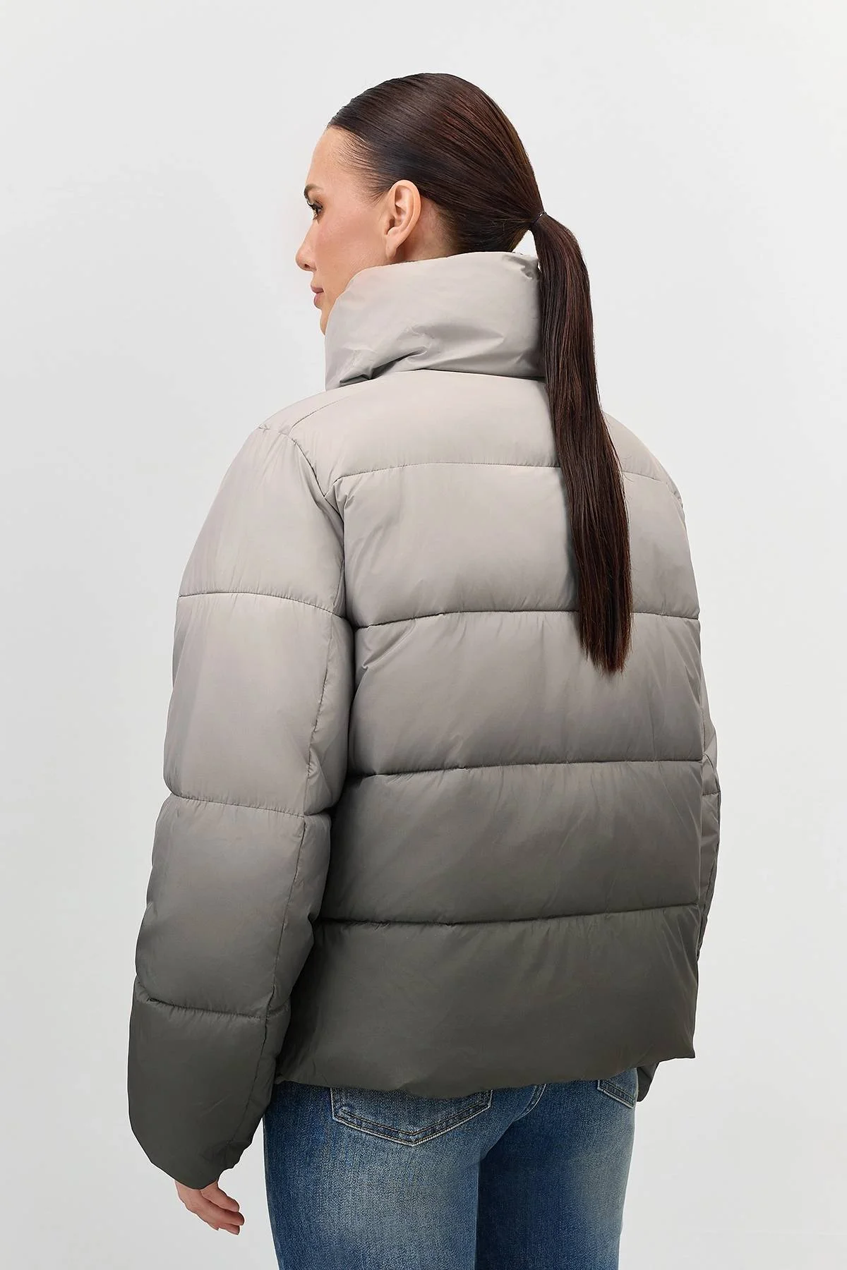 Куртка с монохромным градиентным принтом прямого силуэта. Застежка на молнию. Воротник стойка. Боковые карманы с листочками на кнопках. Дополнена кантом на молнии. Кулиса по низу для защиты от ветра.