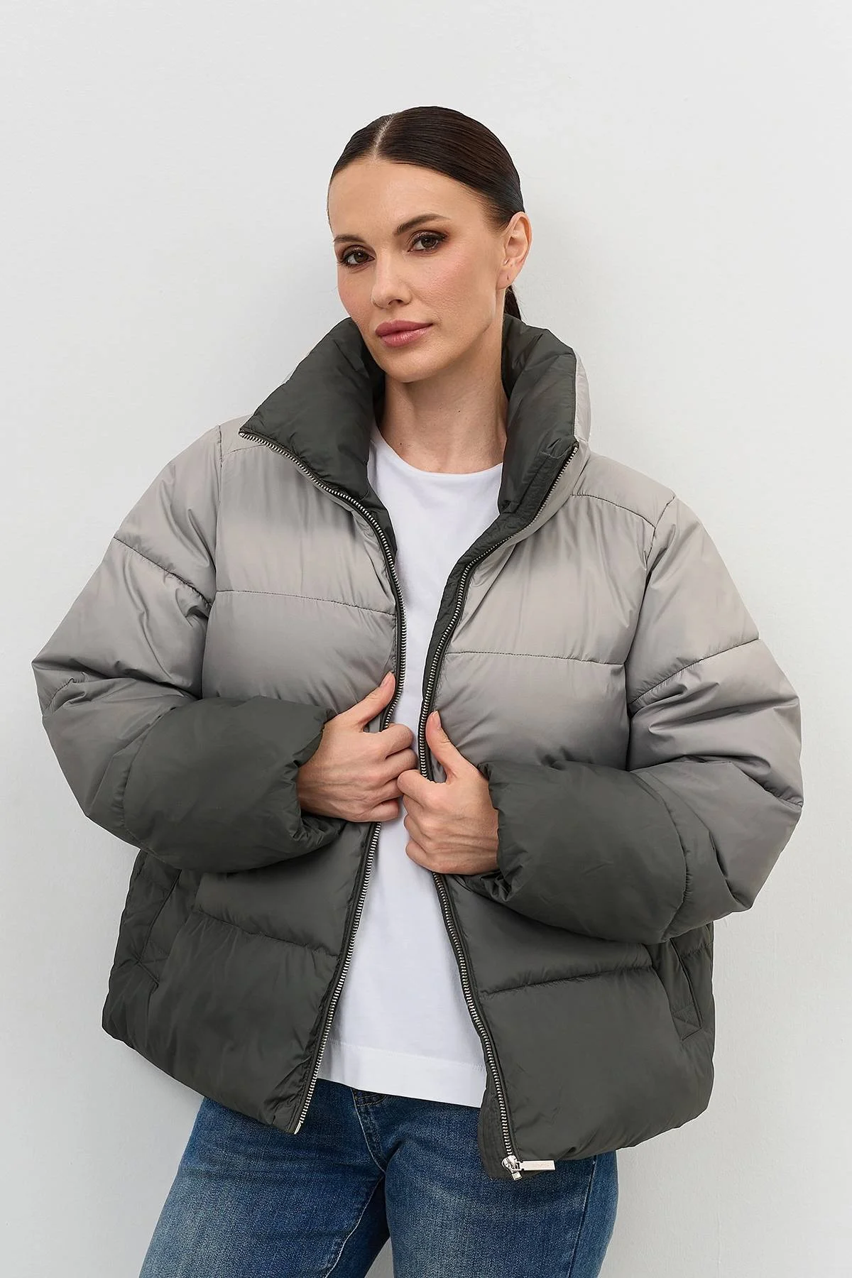Куртка с монохромным градиентным принтом прямого силуэта. Застежка на молнию. Воротник стойка. Боковые карманы с листочками на кнопках. Дополнена кантом на молнии. Кулиса по низу для защиты от ветра.