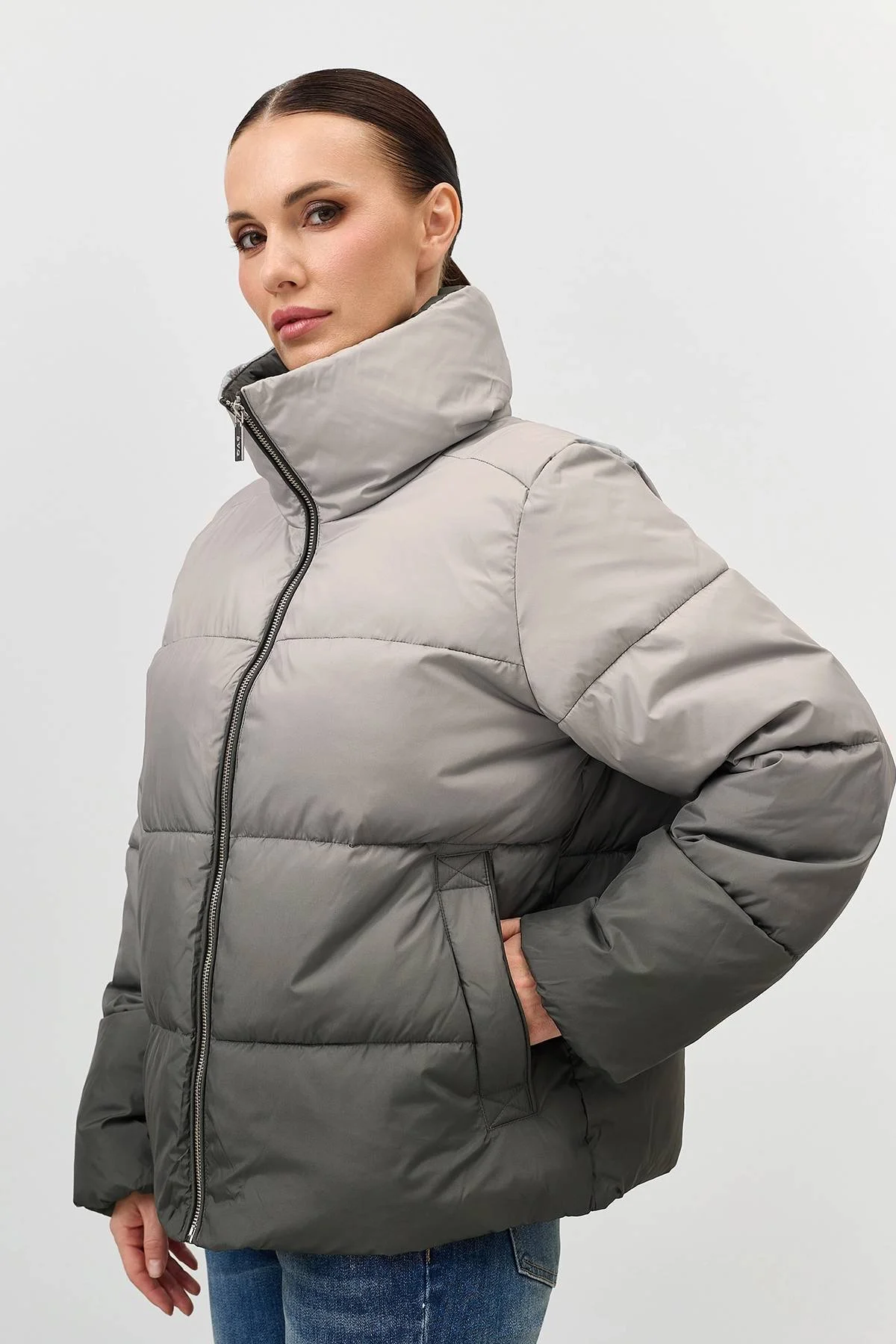 Куртка с монохромным градиентным принтом прямого силуэта. Застежка на молнию. Воротник стойка. Боковые карманы с листочками на кнопках. Дополнена кантом на молнии. Кулиса по низу для защиты от ветра.