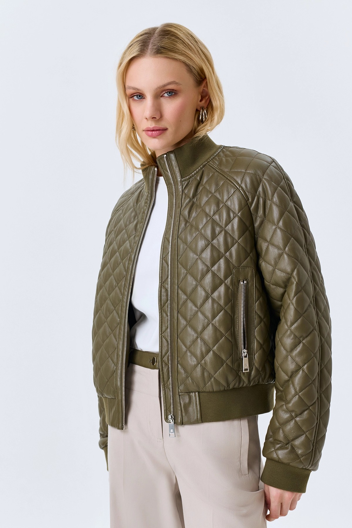 Стеганый бомбер из эко кожи, 48