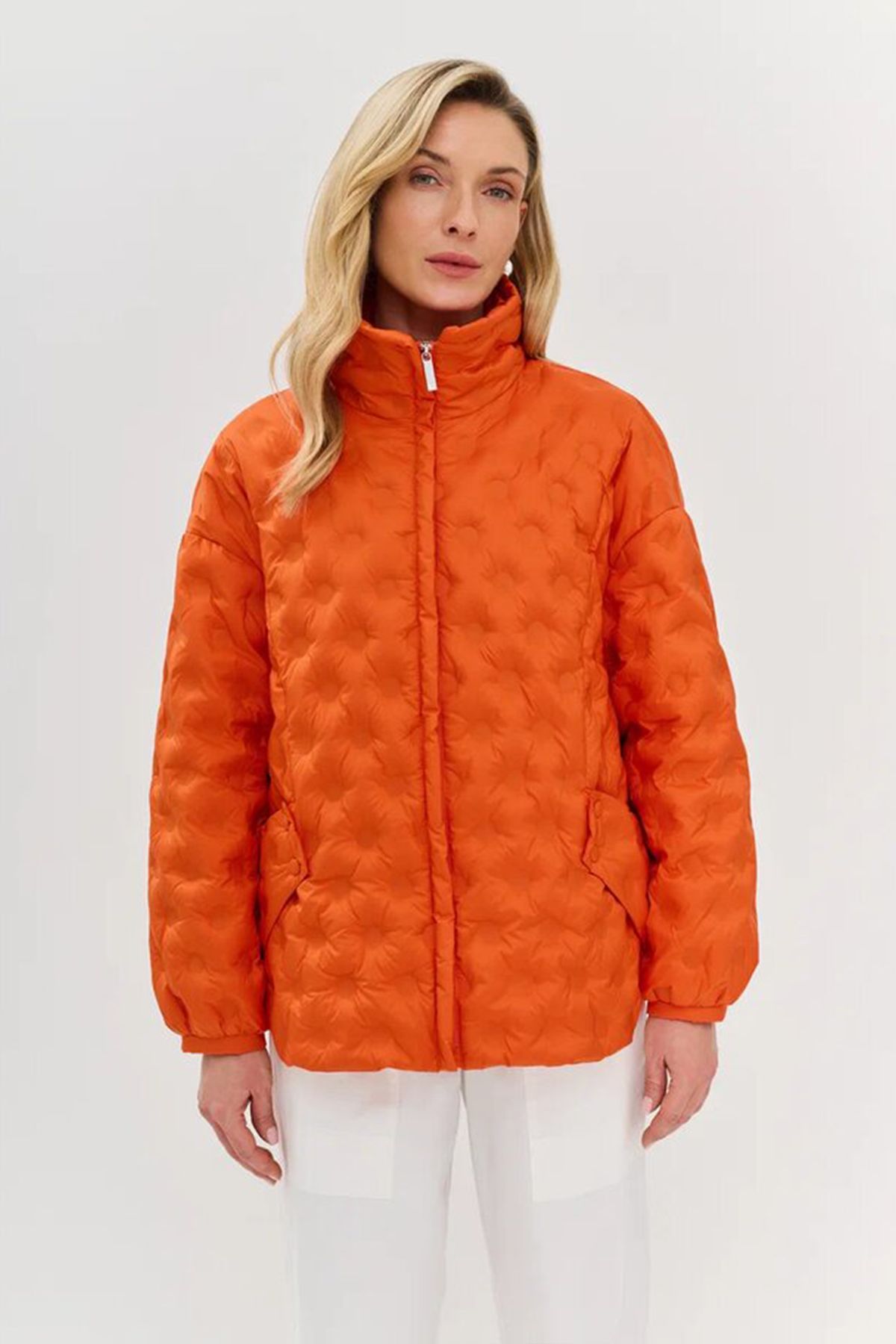 Стильная куртка oversize на натуральном утеплителе с фантазийной стежкой в оранжевом цвете, 46р