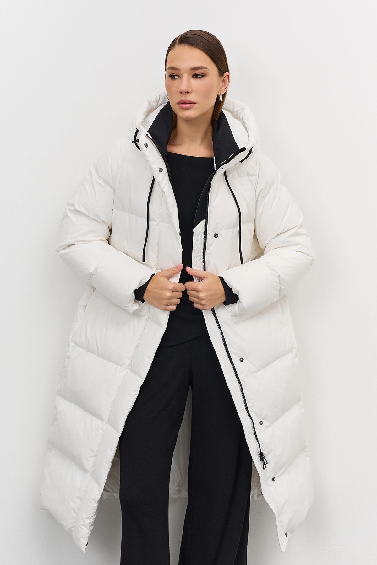 Удлиненное стеганое пальто на натуральном утеплителе. Прямой силуэт. Застежка на молнию и планку с потайными кнопками. Воротник стойка утеплен и дополнен капюшоном с утяжниками и шнурком. Высокие разрезы в боковых швах на кнопках. Боковые карманы в швах. Дополнено утепленной подкладкой из теплоотражающей ткани. Утеплитель- натуральный пух.