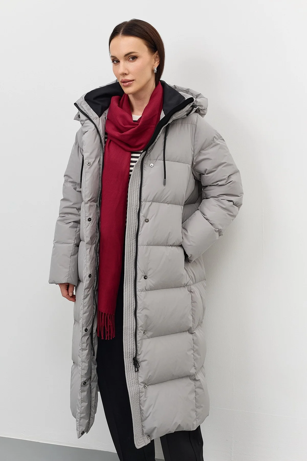 Удлиненное стеганое пальто на натуральном утеплителе. Прямой силуэт. Застежка на молнию и планку с потайными кнопками. Воротник стойка утеплен и дополнен капюшоном с утяжниками и шнурком. Высокие разрезы в боковых швах на кнопках. Боковые карманы в швах. Дополнено утепленной подкладкой из теплоотражающей ткани. Утеплитель- натуральный пух.