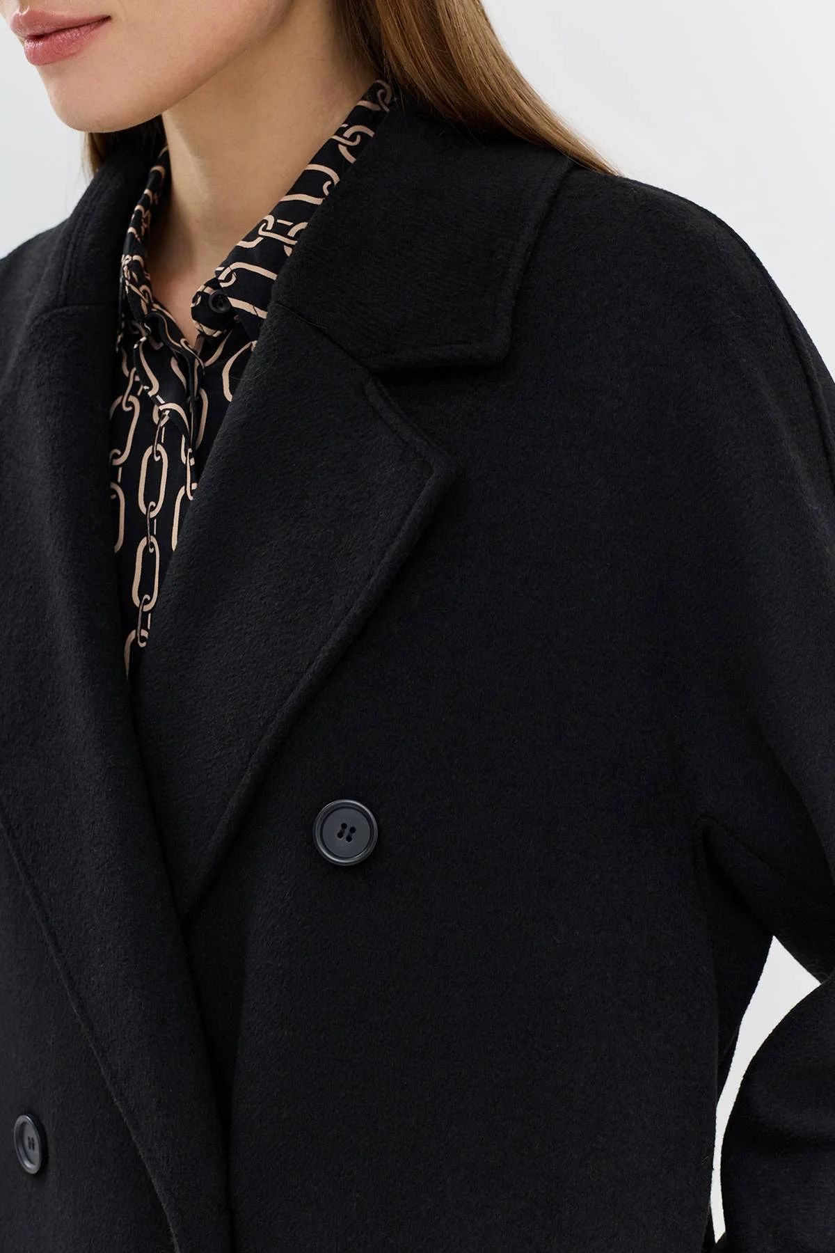Пальто Savage 60201/9 - Классическое двубортное пальто черного цвета с английским воротником создает строгий элегантный силуэт. Прямой крой и два ряда пуговиц подчеркивают лаконичность и универсальность модели. Качественная ткань с добавлением шерсти обеспечивает комфорт и тепло в прохладную погоду. В комплекте с палантином LBL34-348-06