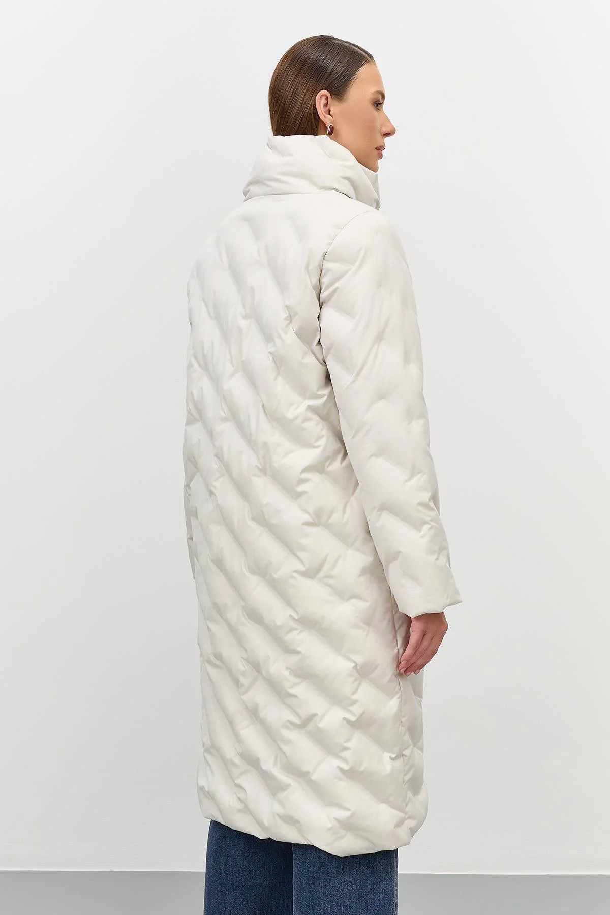 Удлиненное пальто с фантазийной горячей стежкой. Прямой силуэт. Длинные втачные рукава. Воротник высокая стойка. Застежка на скрытые кнопки. Боковые карманы в швах на потайных молниях.