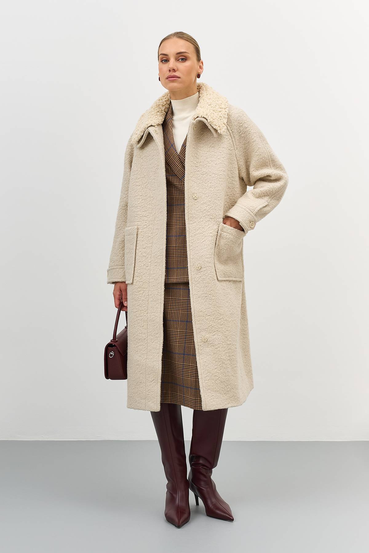 Пальто Savage - элегантное длинное пальто из мягкого шерстяного материала в светло-бежевом цвете отлично защищает от холода и создаёт уютный образ. Его особенностью являются широкий пушистый воротник и скрытая застежка, придающие модели современный и лаконичный стиль. Практичные карманы и классический крой делают это пальто идеальным выбором для зимних прогулок. В комплекте с палантином SVG302512 .