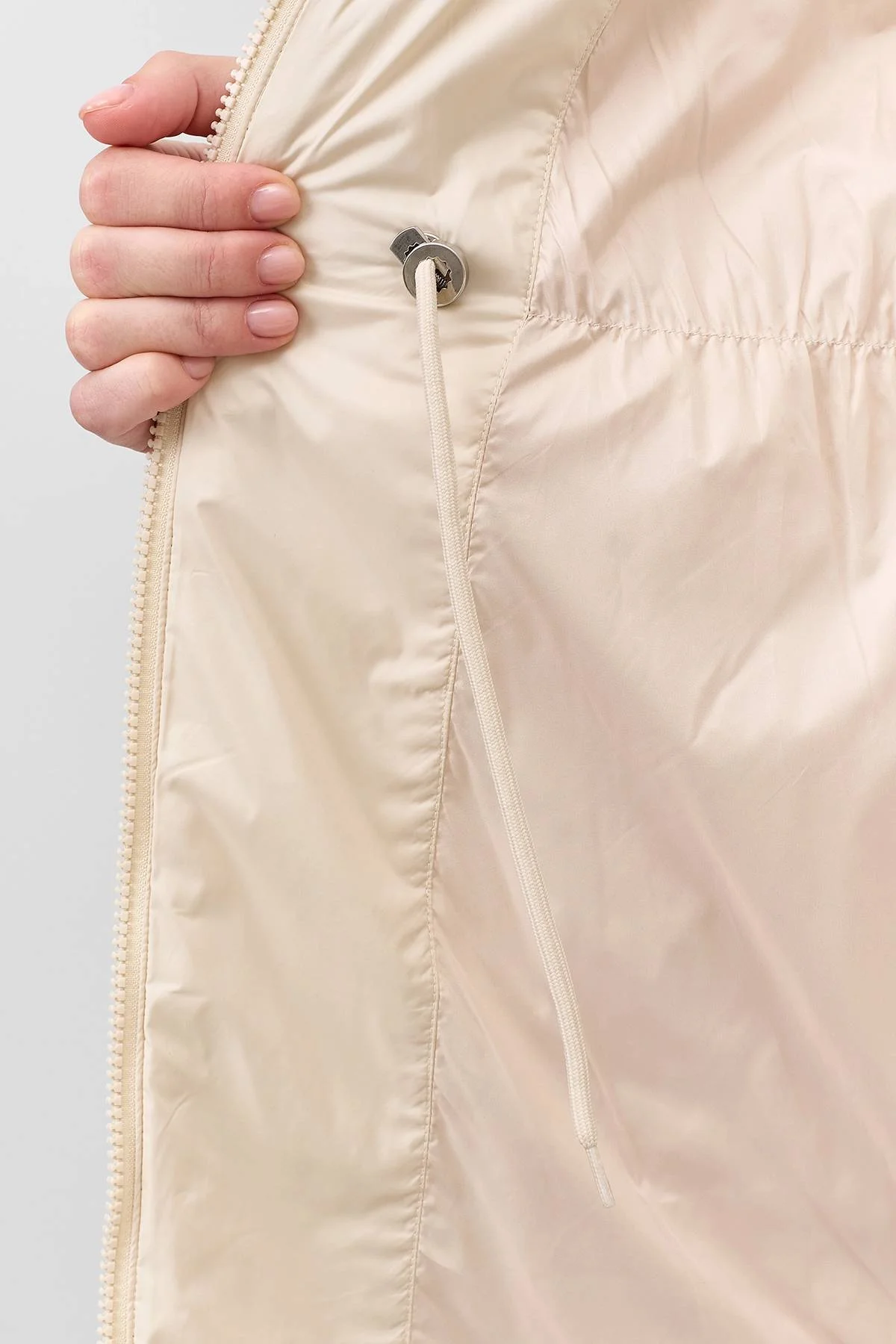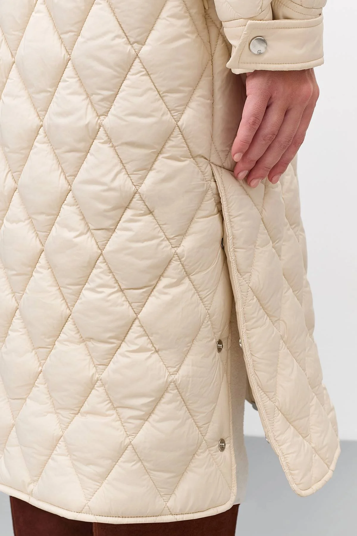 Легкое стеганое пальто с акцентным воротником стойкой. Прямой силуэт можно приталить кулисой по линии талии. Застежка на молнию. Завышенные боковые карманы с листочками на кнопках. Воротник высокая стойка на кнопках с кулисой. Высокие шлицы в боковых швах на кнопках. Манжеты на кнопках по низу рукавов.