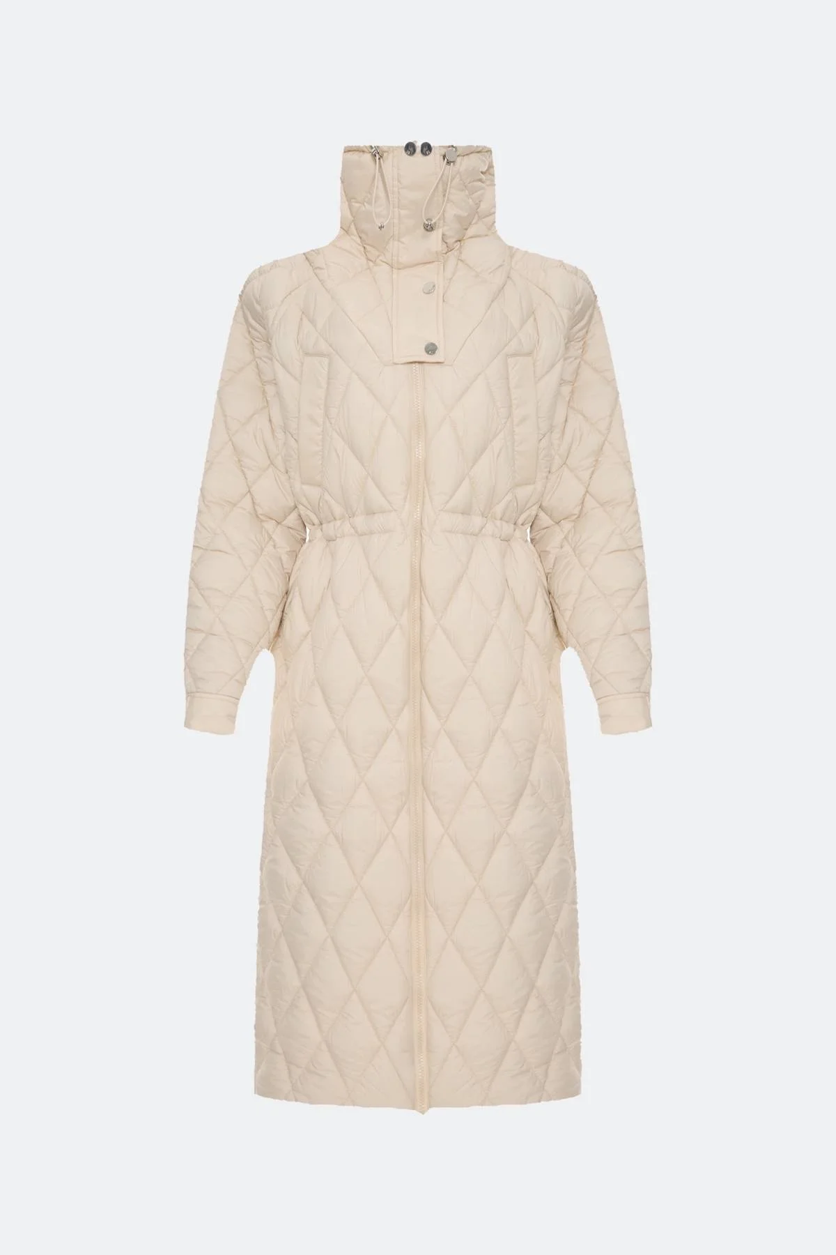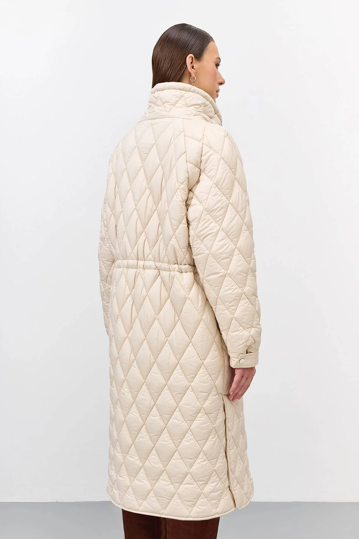 Легкое стеганое пальто с акцентным воротником стойкой. Прямой силуэт можно приталить кулисой по линии талии. Застежка на молнию. Завышенные боковые карманы с листочками на кнопках. Воротник высокая стойка на кнопках с кулисой. Высокие шлицы в боковых швах на кнопках. Манжеты на кнопках по низу рукавов.