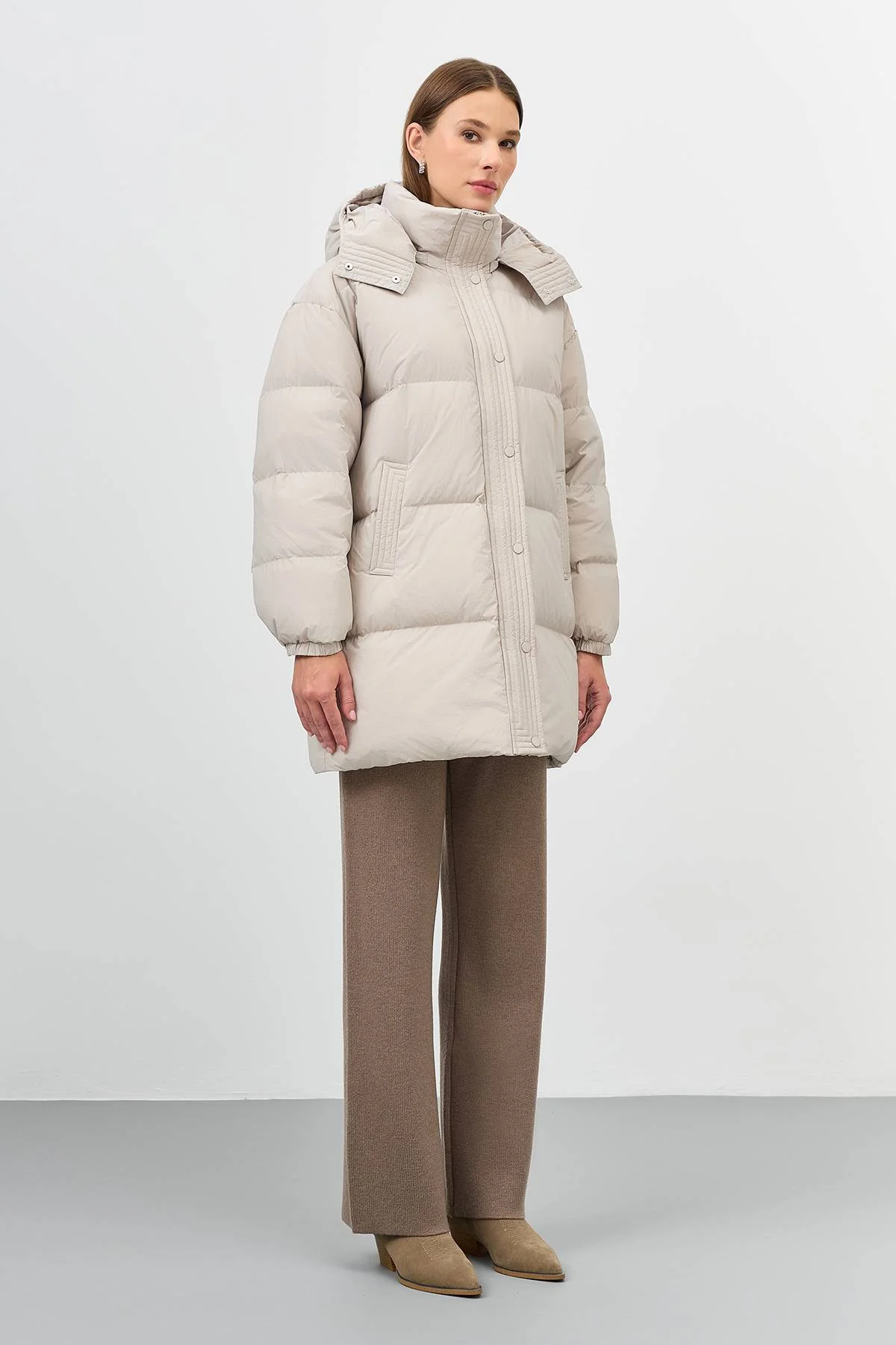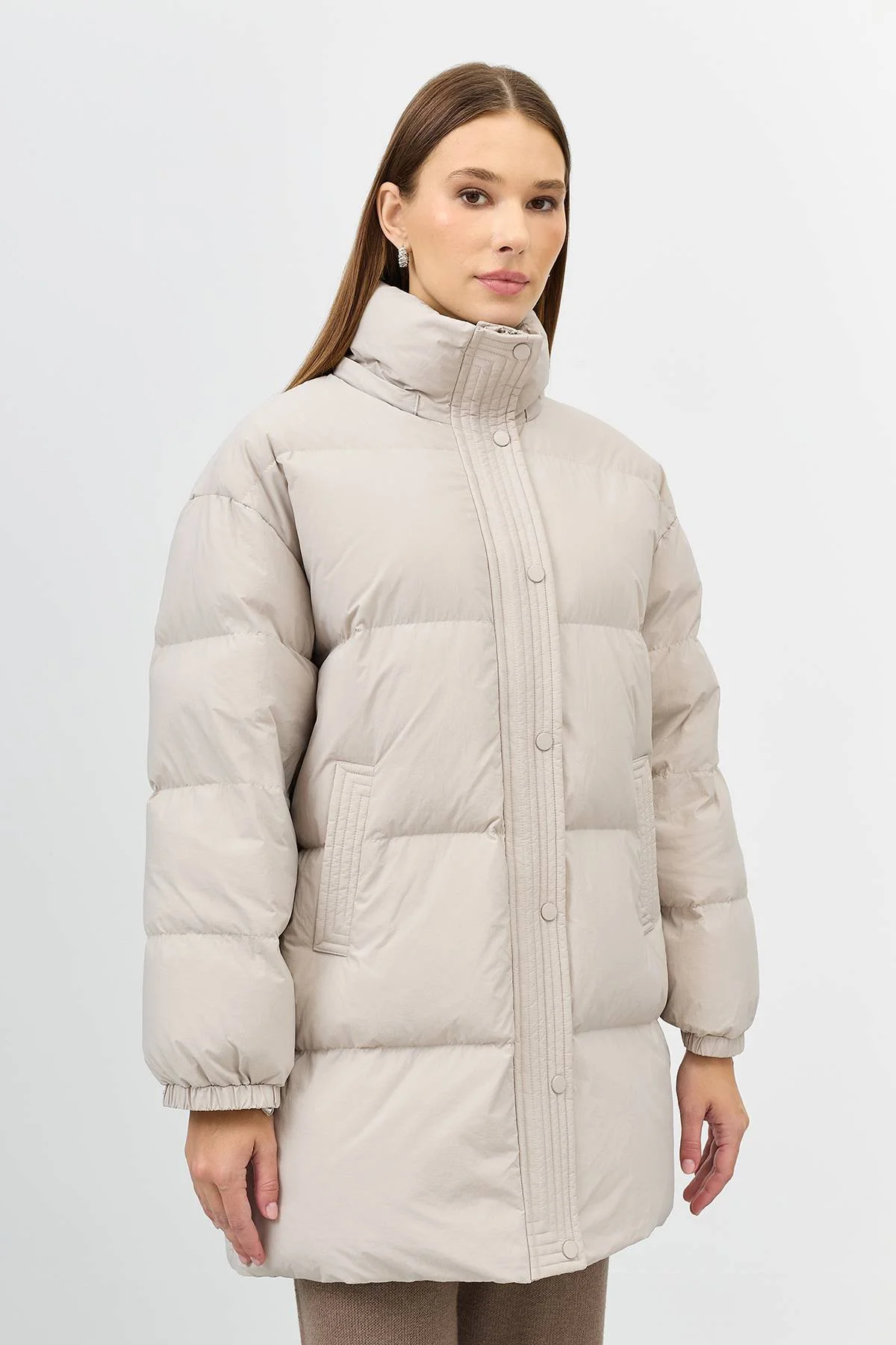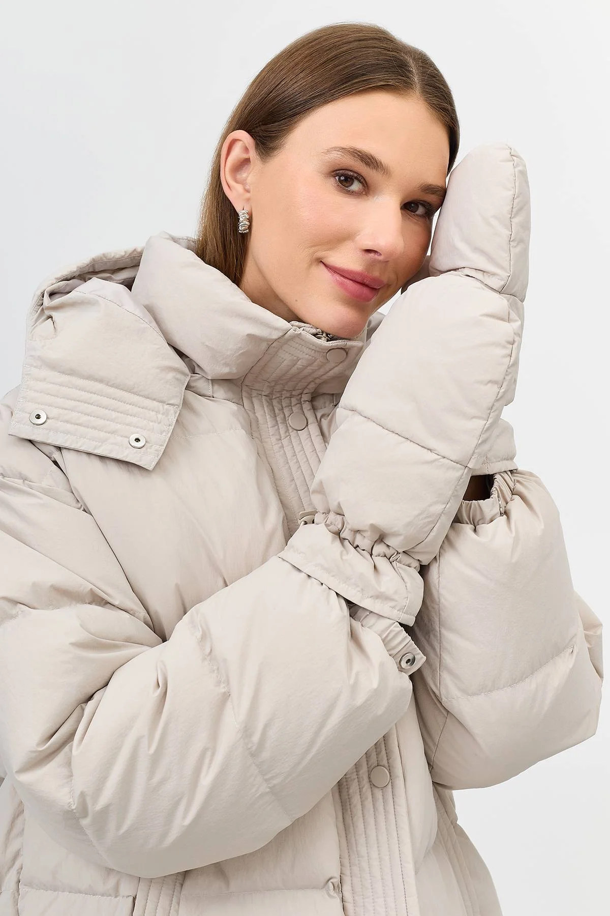 Теплый пуховик со съемными варежками с утяжниками на кнопках. Длина до середины колен. Свободный силуэт. Спущенная линия плеч. Высокий воротник стойка дополнен съёмным капюшоном с утяжниками на кнопках. Боковые карманы с листочками. Застежка на молнию и планку с кнопками в тон. Резинки по низу рукавов. Утеплитель- натуральный пух.