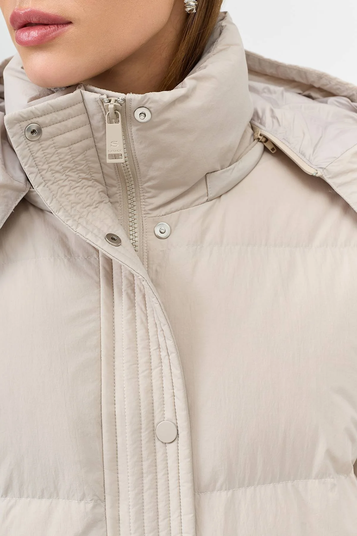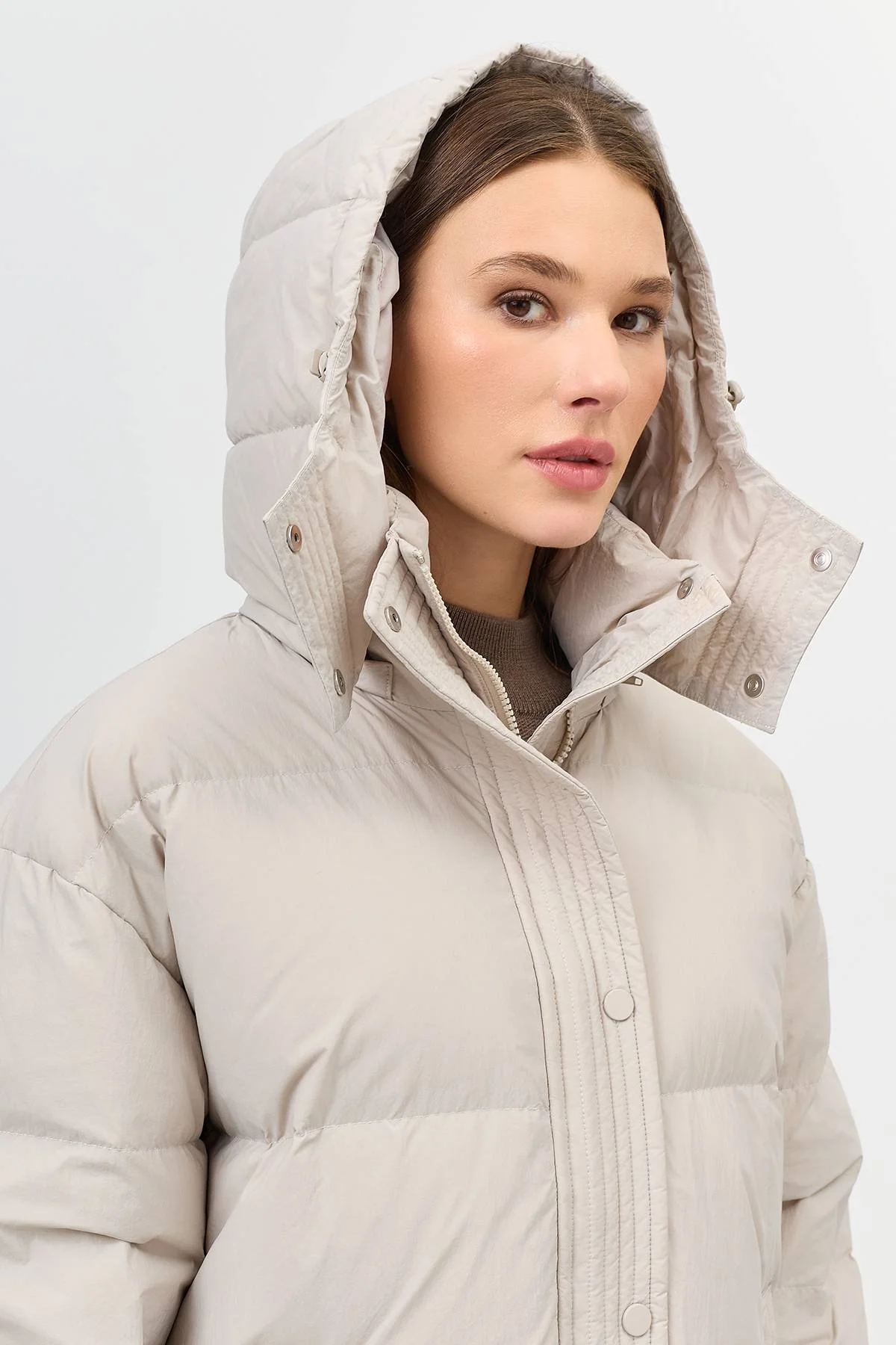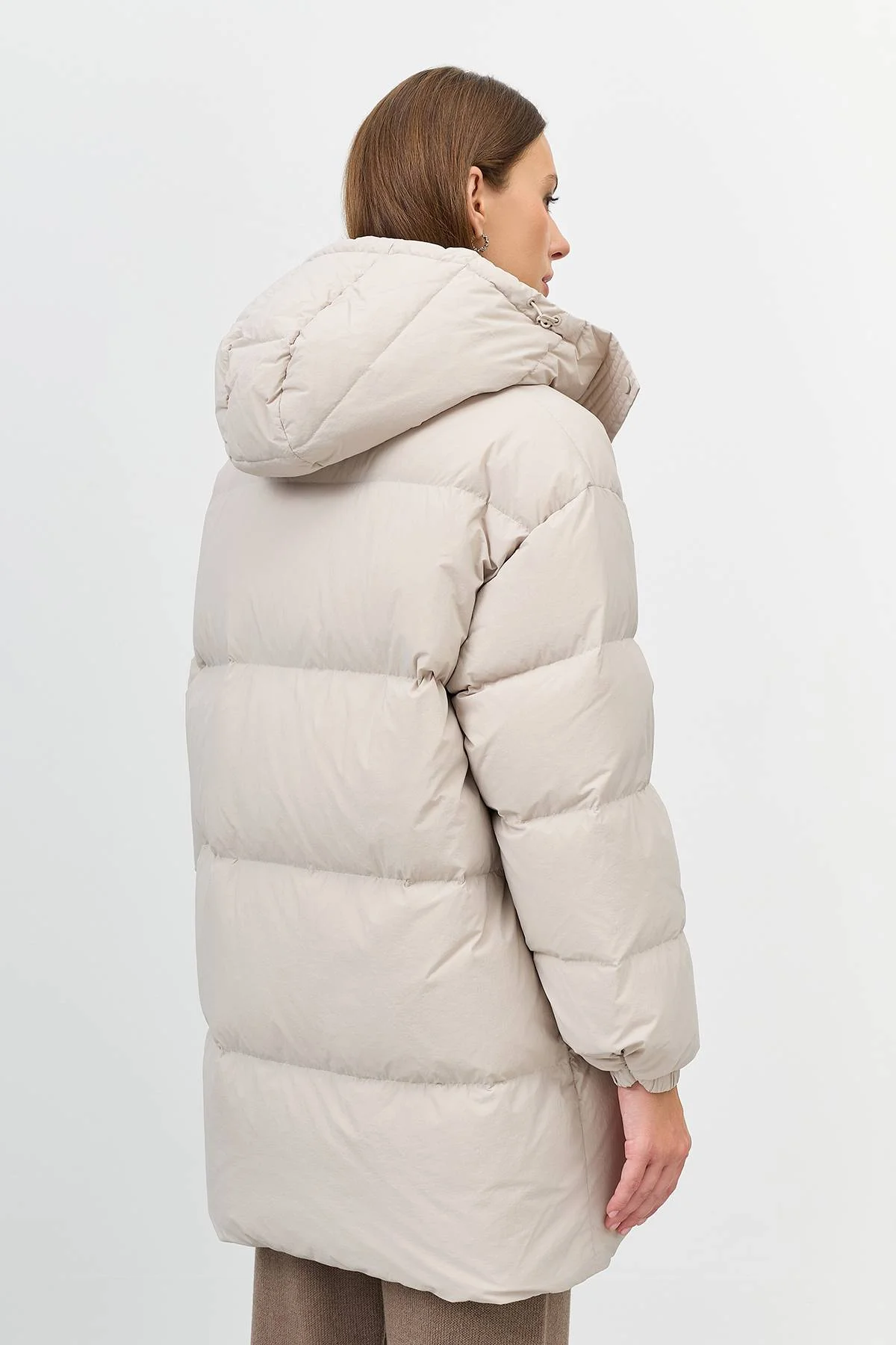 Теплый пуховик со съемными варежками с утяжниками на кнопках. Длина до середины колен. Свободный силуэт. Спущенная линия плеч. Высокий воротник стойка дополнен съёмным капюшоном с утяжниками на кнопках. Боковые карманы с листочками. Застежка на молнию и планку с кнопками в тон. Резинки по низу рукавов. Утеплитель- натуральный пух.