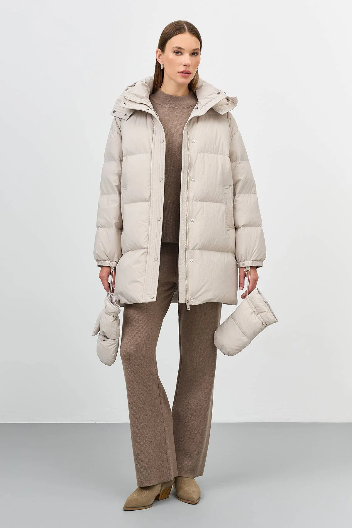Теплый пуховик со съемными варежками с утяжниками на кнопках. Длина до середины колен. Свободный силуэт. Спущенная линия плеч. Высокий воротник стойка дополнен съёмным капюшоном с утяжниками на кнопках. Боковые карманы с листочками. Застежка на молнию и планку с кнопками в тон. Резинки по низу рукавов. Утеплитель- натуральный пух.