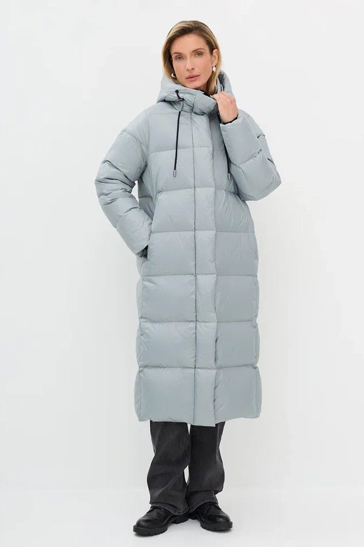Пуховое пальто с контрастными деталями, 52р