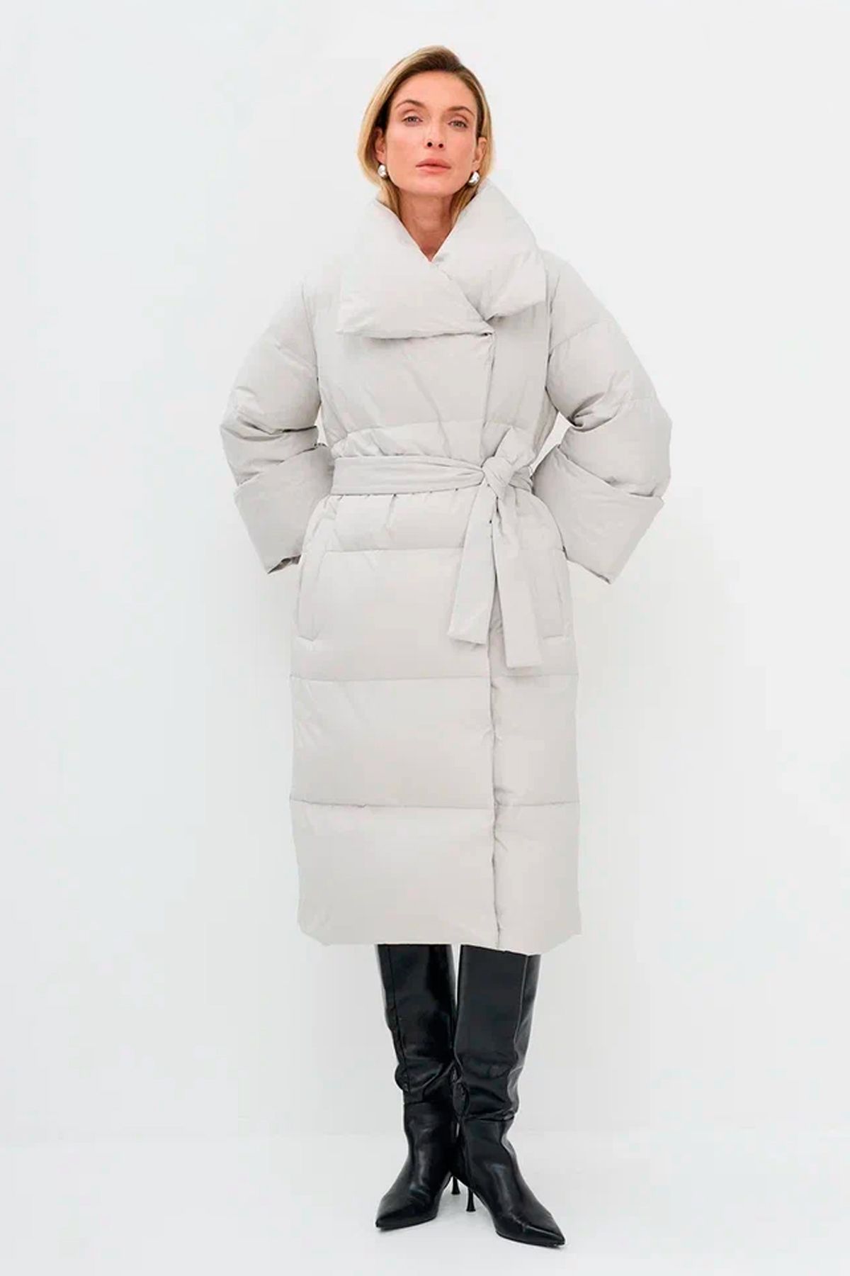 Пуховое пальто светло-серого цвета с поясом, 44р