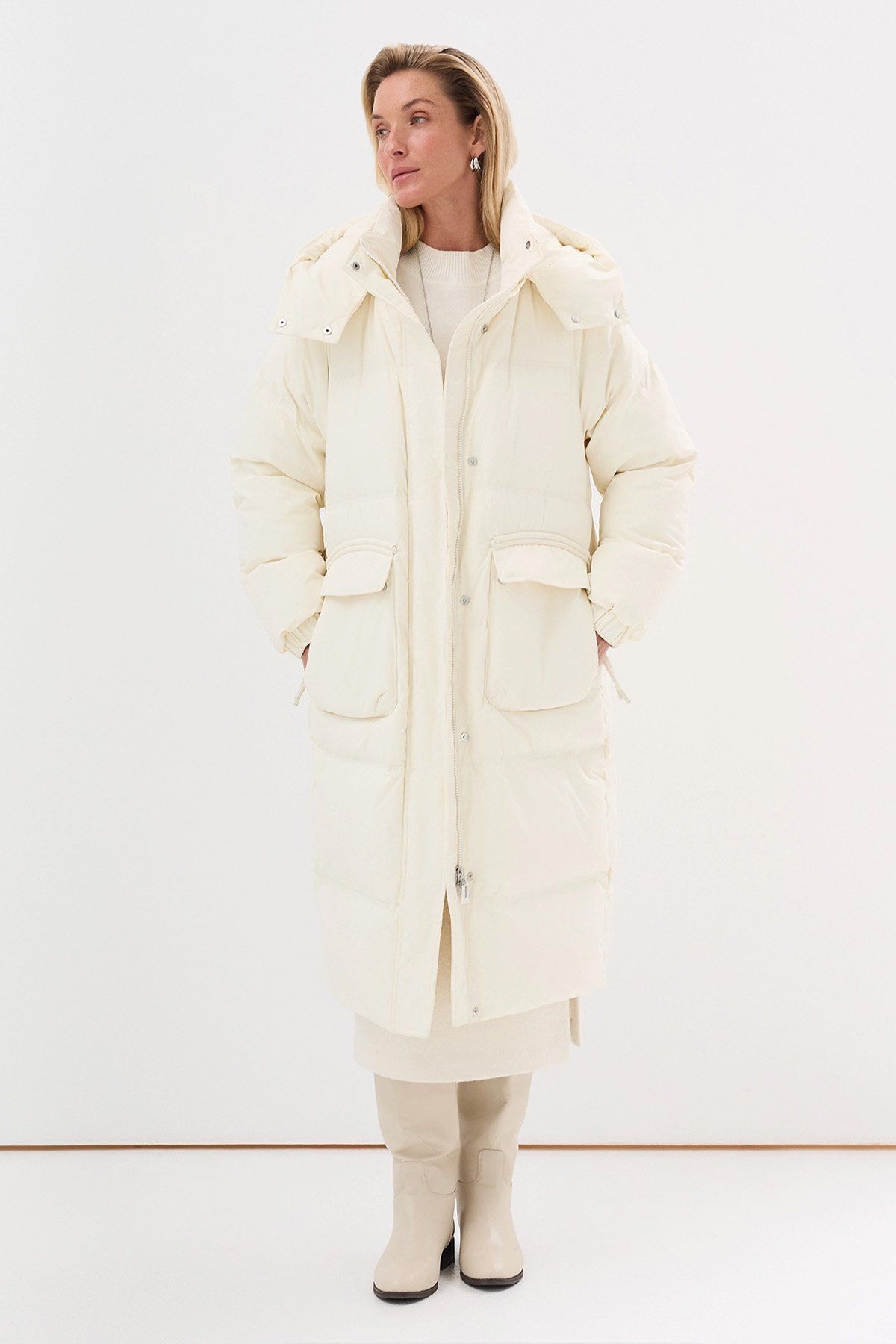 Пуховое пальто свободного силуэта с капюшоном в молочном цвете, 50р