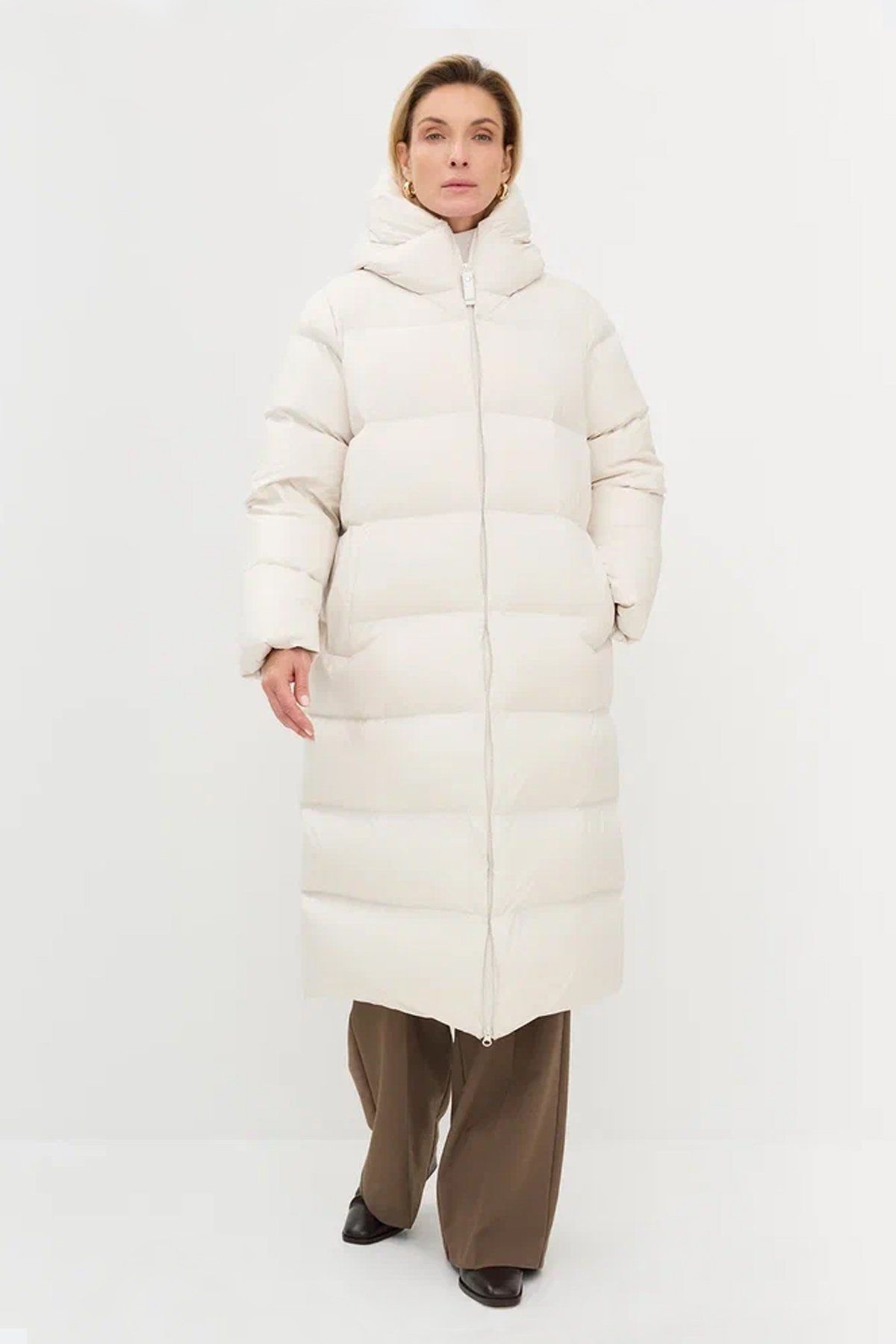 Удлиненное пальто свободного силуэта из натурального пуха в светло-бежевом цвете, 52р