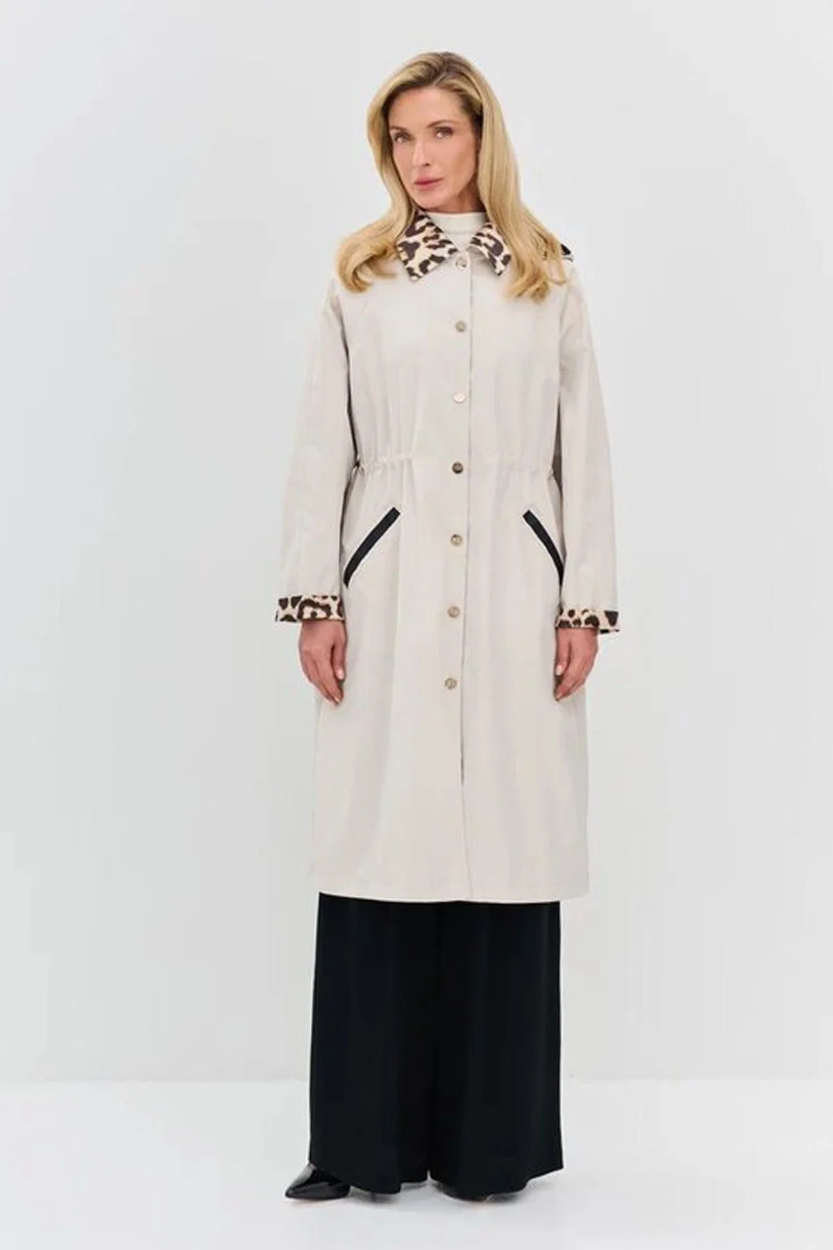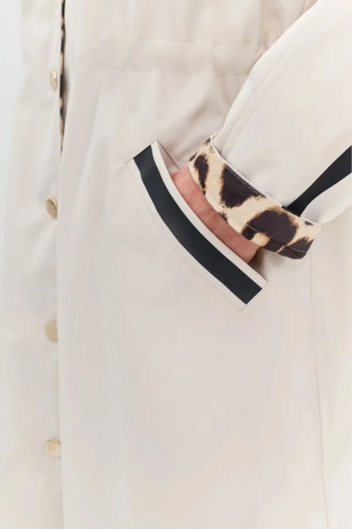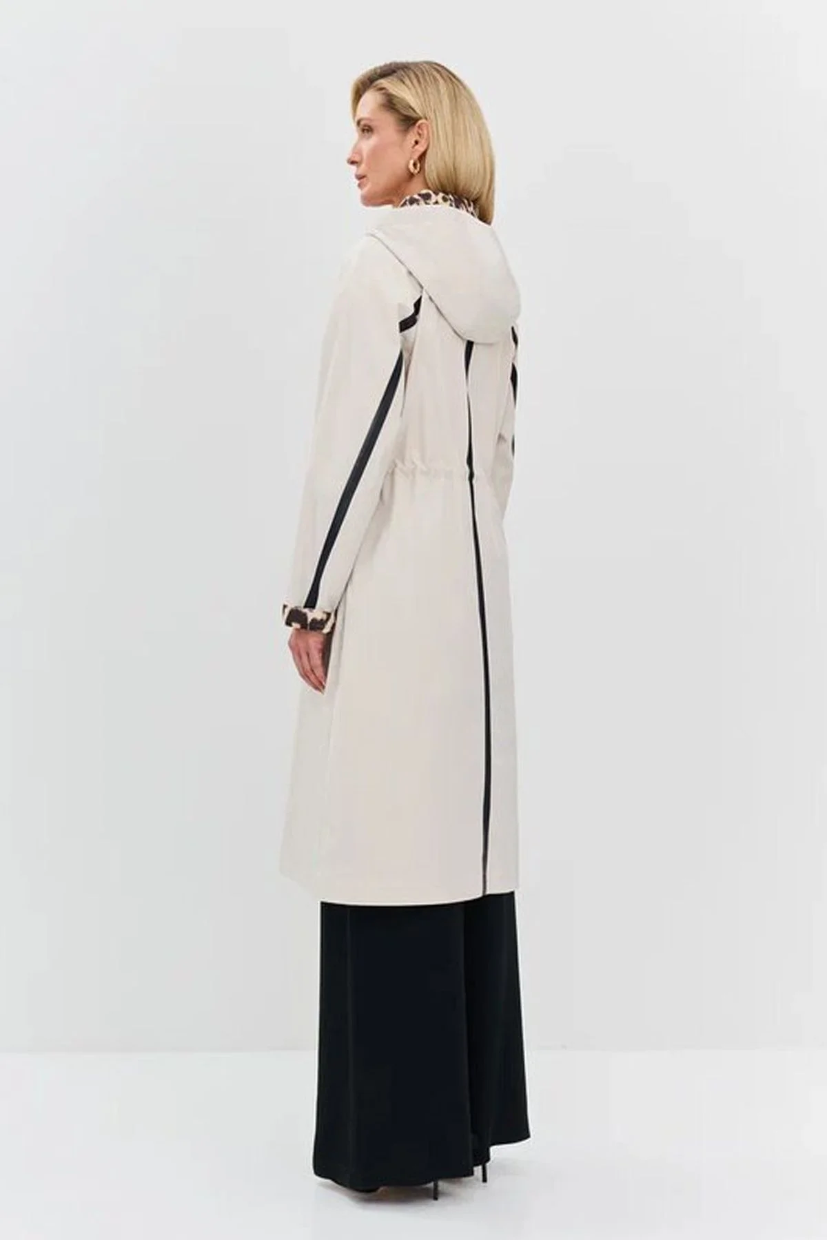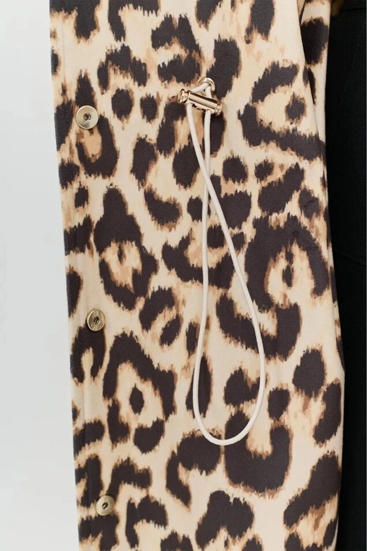 Стильный бежевый плащ сочетает современный дизайн и функциональность, идеально подходя для межсезонья. Универсальный цвет и чёрные вставки позволяют легко комбинировать его с различными образами, от повседневного до вечернего. Съёмный капюшон и регулируемая талия обеспечивают удобство и возможность изменения стиля. Отложной воротник добавляет элегантности, а металлические кнопки придают современный вид. Особый акцент — леопардовый принт на изнаночной стороне, который добавляет оригинальности и позволяет разнообразить стиль, подбирая его к различным нарядам. Удобные карманы создают практичность, сохраняя все необходимые мелочи под рукой. Этот плащ станет отличным выбором для создания разнообразных образов, помогая вам выглядеть стильно и уверенно в любой ситуации.