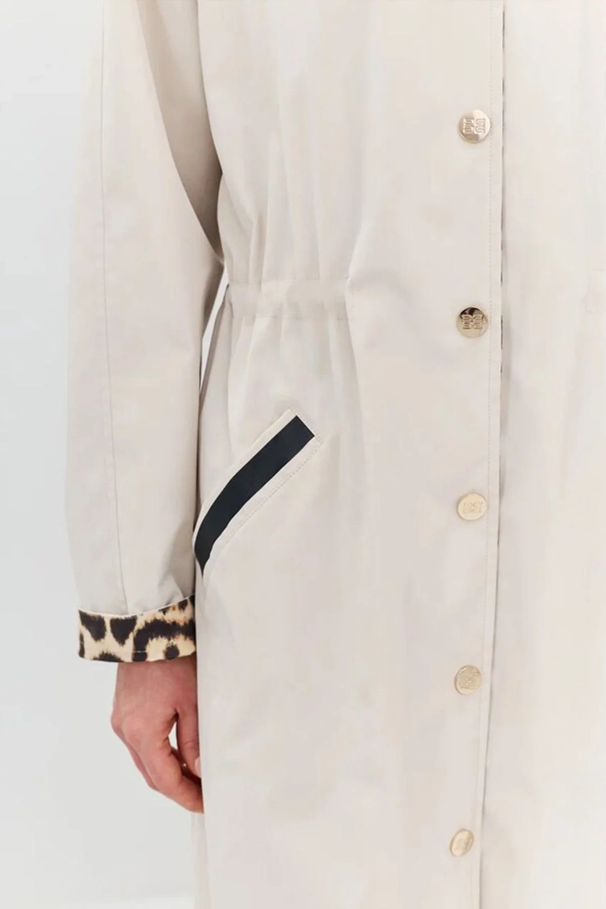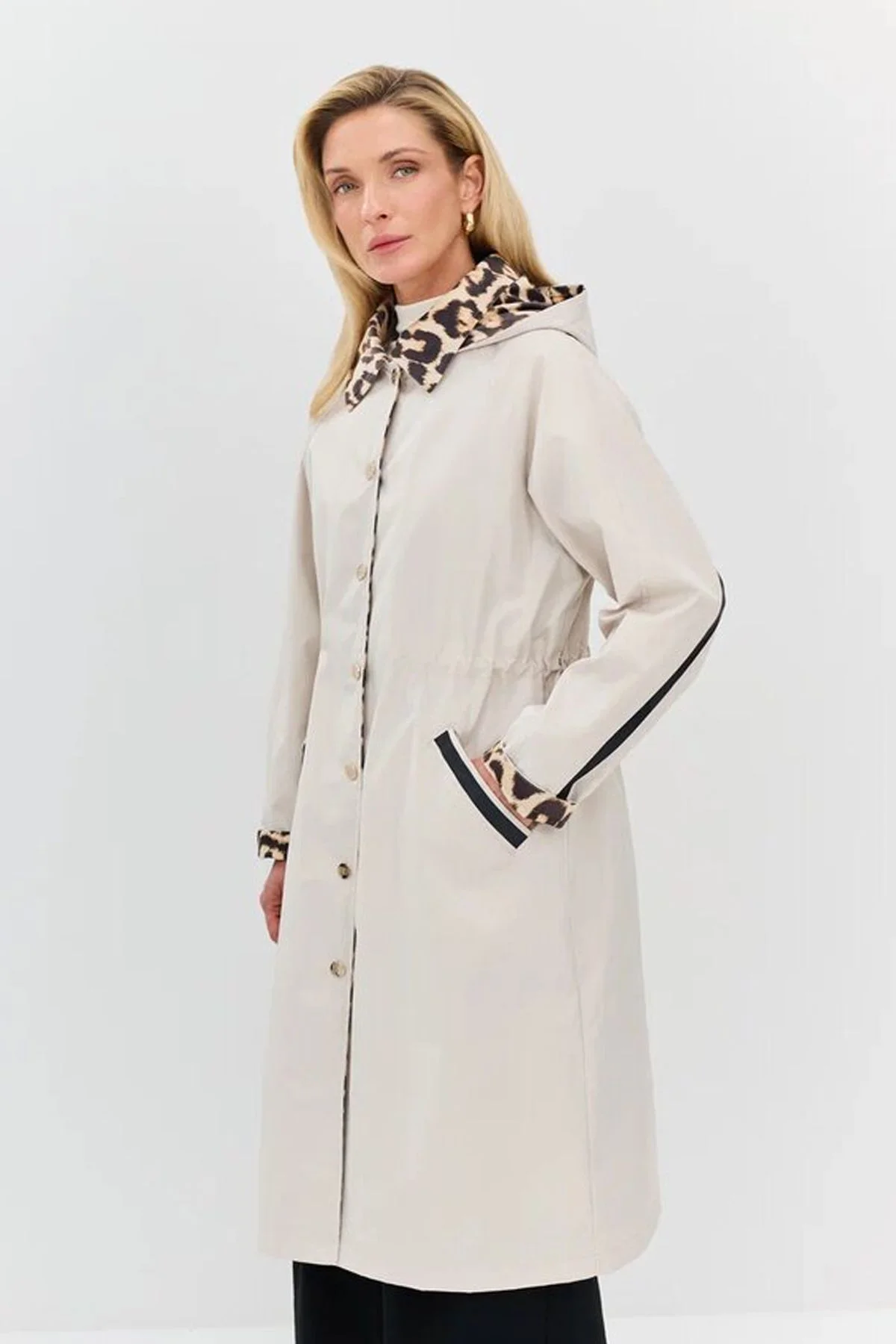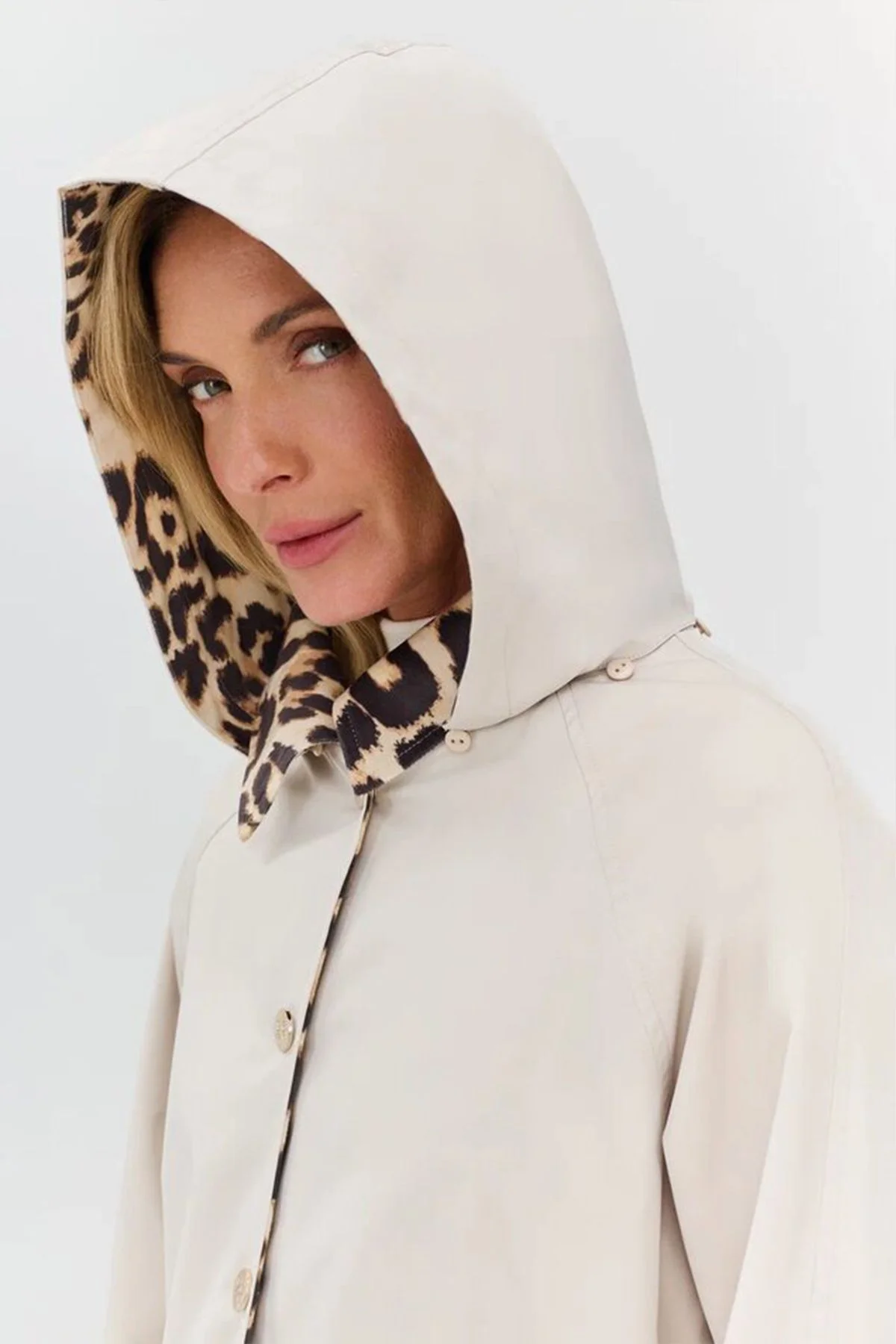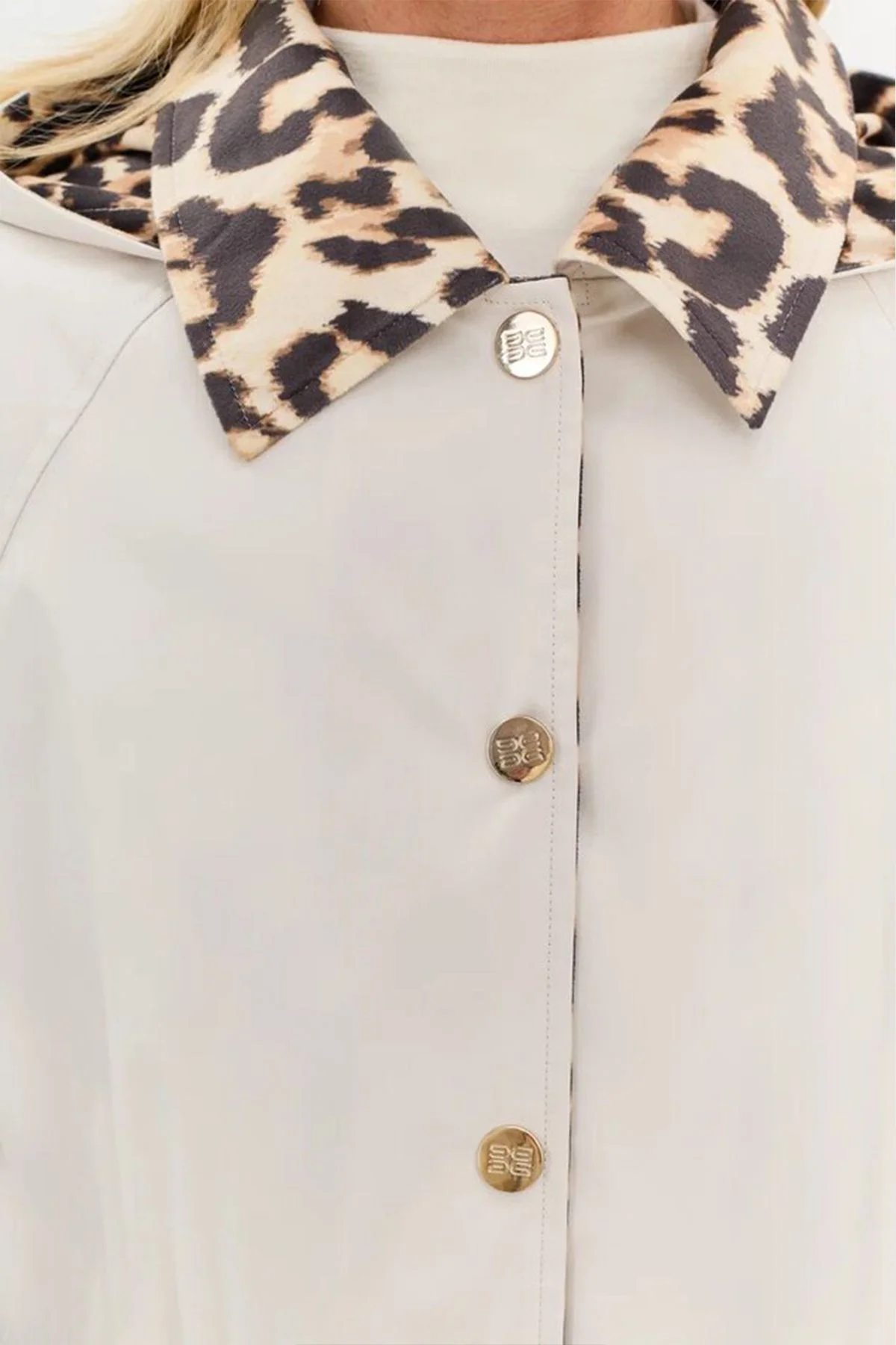 Стильный бежевый плащ сочетает современный дизайн и функциональность, идеально подходя для межсезонья. Универсальный цвет и чёрные вставки позволяют легко комбинировать его с различными образами, от повседневного до вечернего. Съёмный капюшон и регулируемая талия обеспечивают удобство и возможность изменения стиля. Отложной воротник добавляет элегантности, а металлические кнопки придают современный вид. Особый акцент — леопардовый принт на изнаночной стороне, который добавляет оригинальности и позволяет разнообразить стиль, подбирая его к различным нарядам. Удобные карманы создают практичность, сохраняя все необходимые мелочи под рукой. Этот плащ станет отличным выбором для создания разнообразных образов, помогая вам выглядеть стильно и уверенно в любой ситуации.