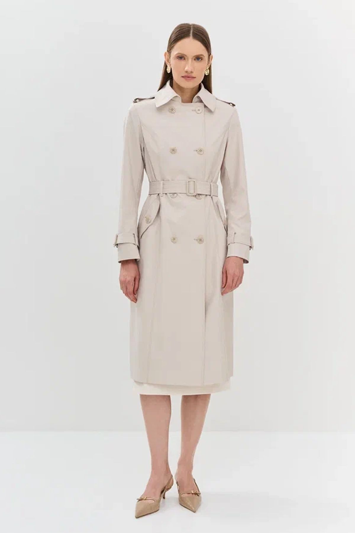 Классический плащ приталенного силуэта в светло-бежевом цвете, 48р